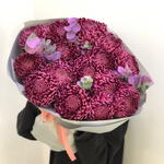 “Velvet Chrysanthemums” — букет, который невозможно забыть. Густые, бархатные хризантемы глубокого фуксия-оттенка создают эффект роскошного объёма, а нежные веточки эвкалипта добавляют легкости и утончённого аромата.