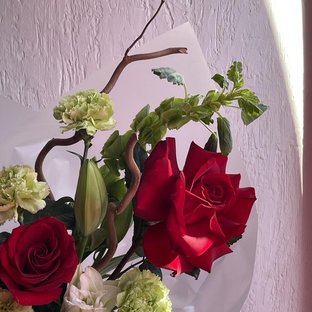 Роза - 4 шт. Диантус - 4 шт. Лилия Белая - 1 шт. Упаковка дизайнерская - 3 шт. Аквабокс - 1 шт. Открыточка с вашими пожеланиями - 1 шт. Молюцелла - 1 шт. инструкция по уходу за цветами - 1 шт. Корилус Конторта - 2 шт. витамины для цветов (кризал) - 1 шт.
