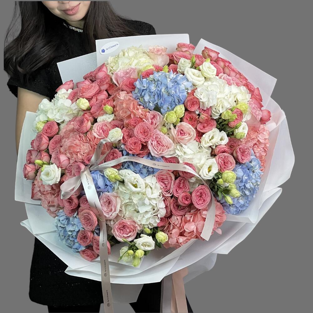 Гортензия - 15 шт. пионовидные розы - 12 шт. лизиантусы - 10 шт. спрей розы - 15 шт. аква бумага - 2 шт.