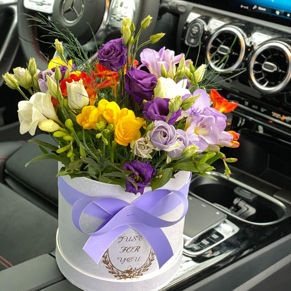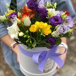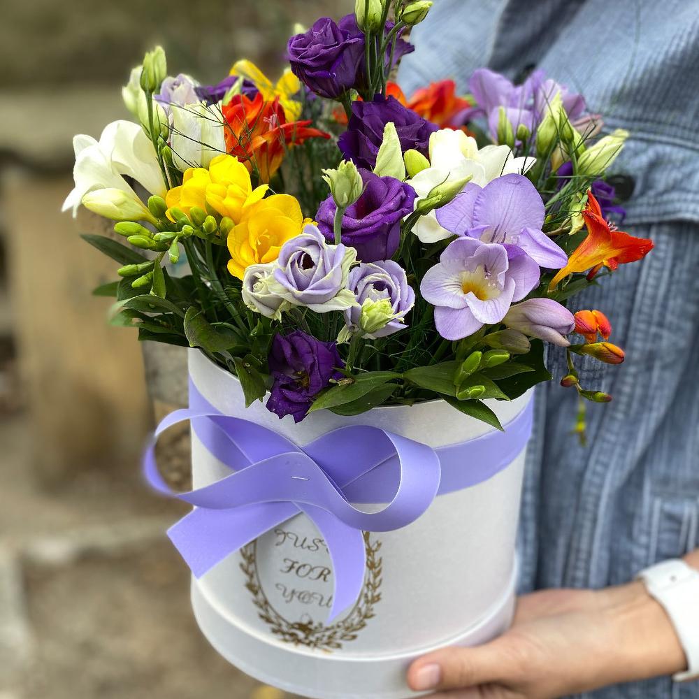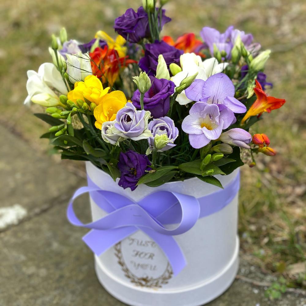 Композиция в коробке из ароматных фрезий и фиолетовых эустом. Нежнейший аромат фрезий: ненавязчиво, но при этом выразительно, просто "ВАХ" )))
