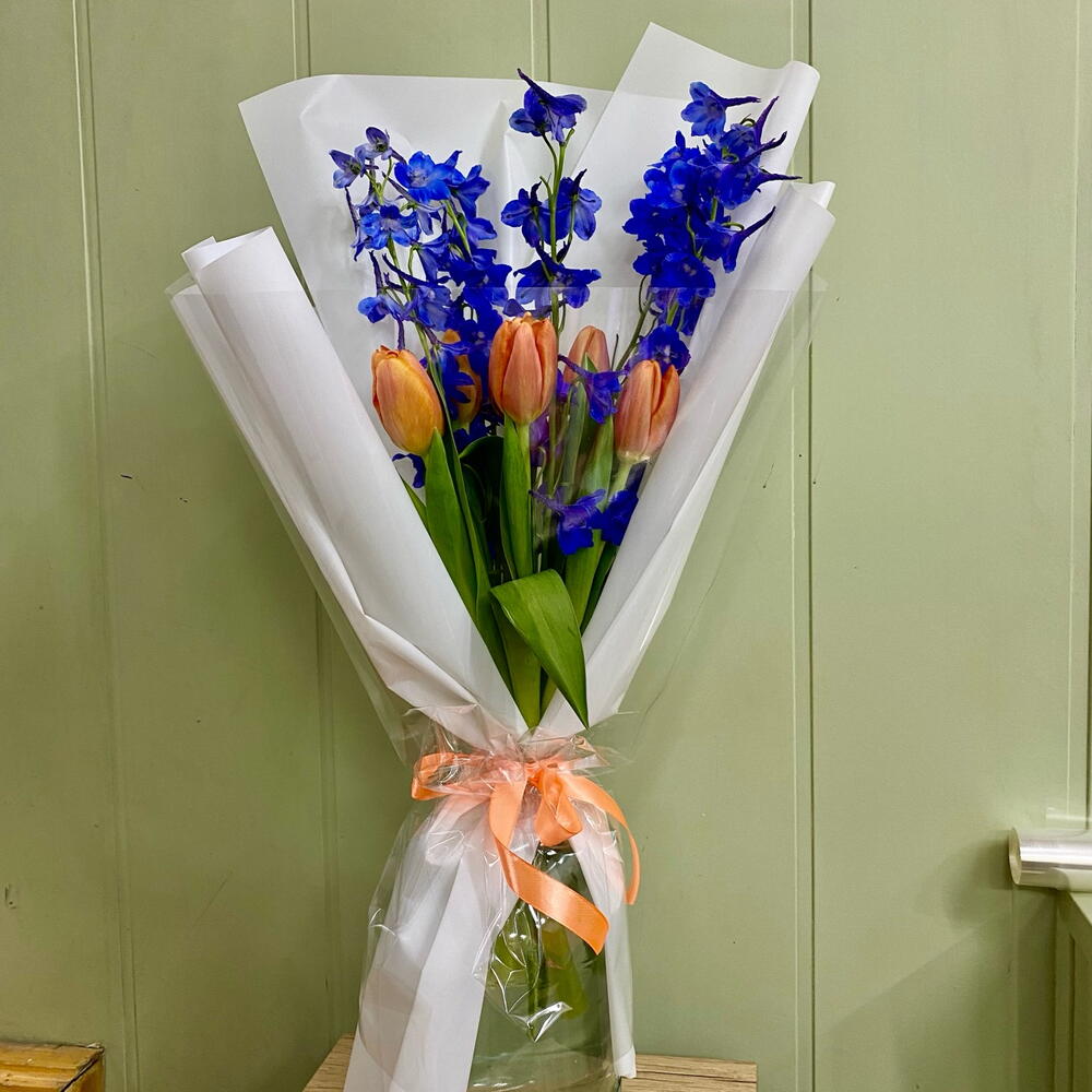 Дельфиниум Синий - 5 шт. тюльпаны оранжевые - 6 шт.