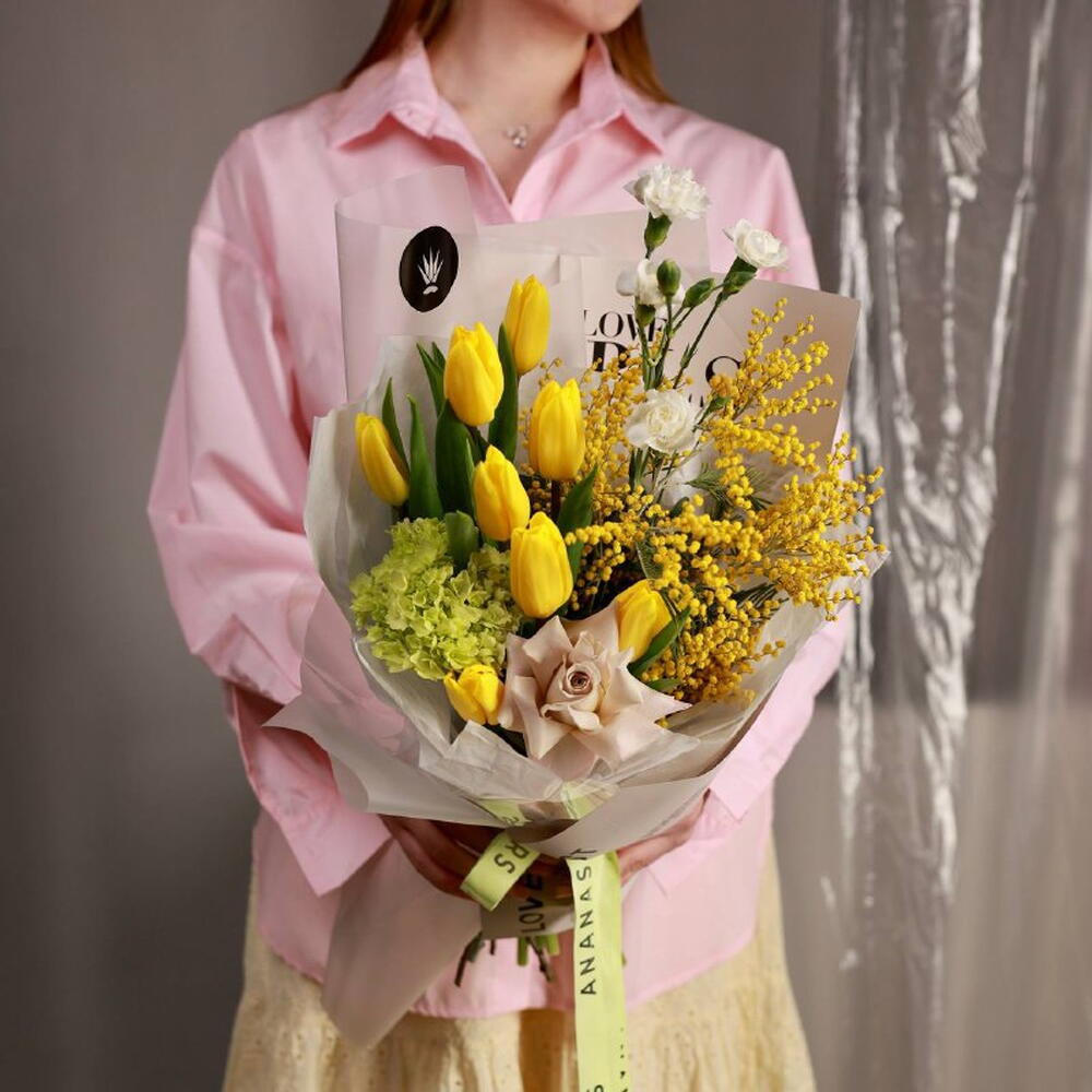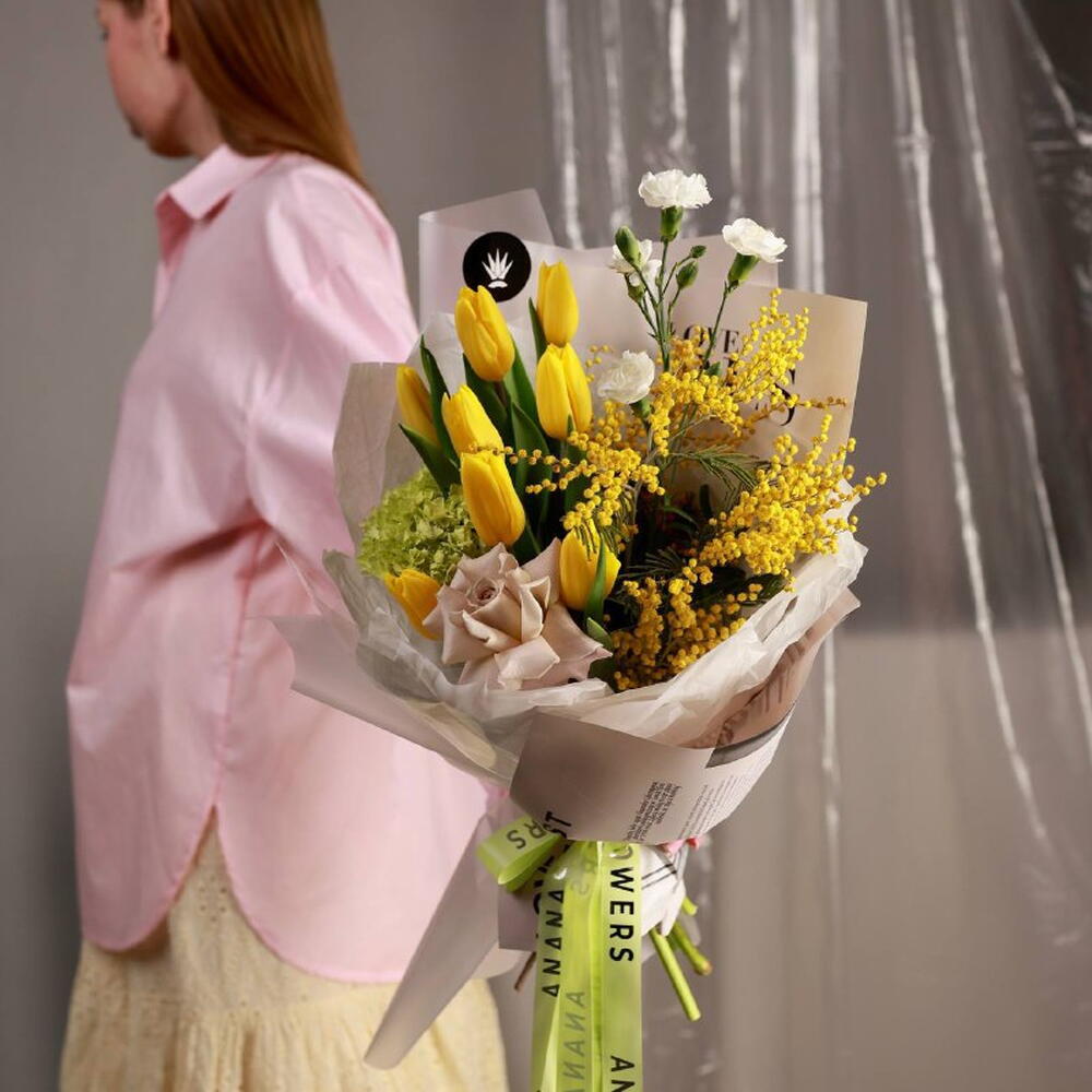 Весенний букет с ароматной мимозой и солнечными тюльпанами