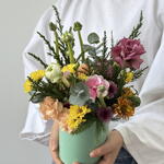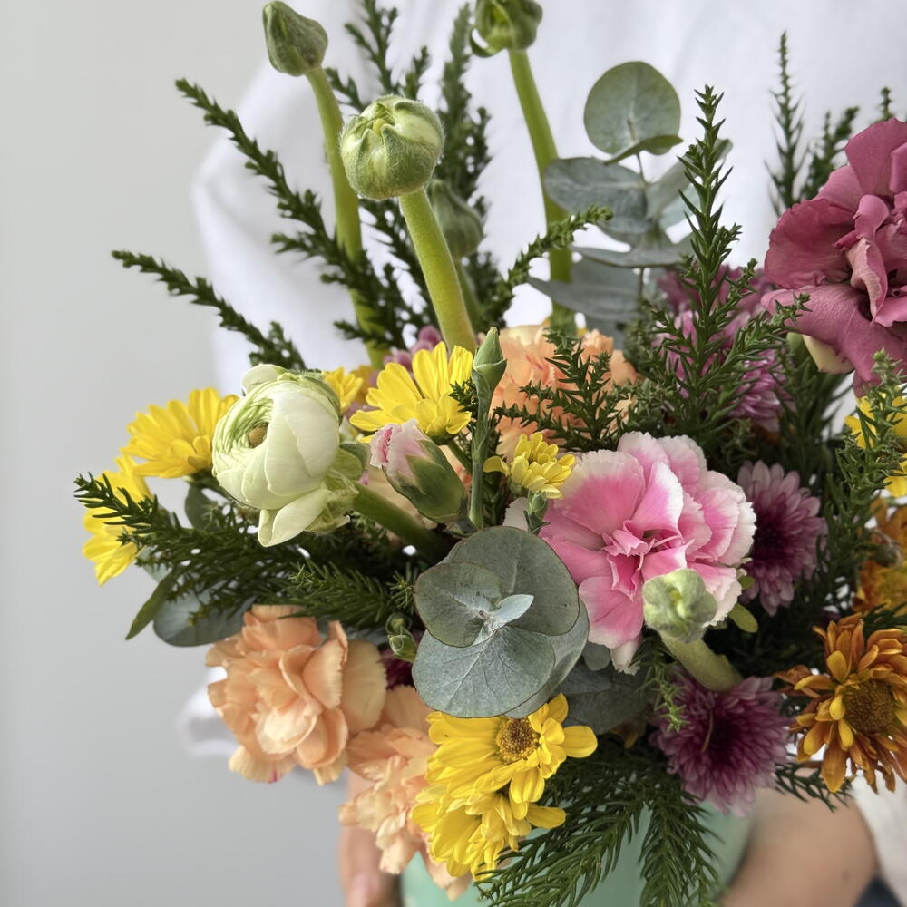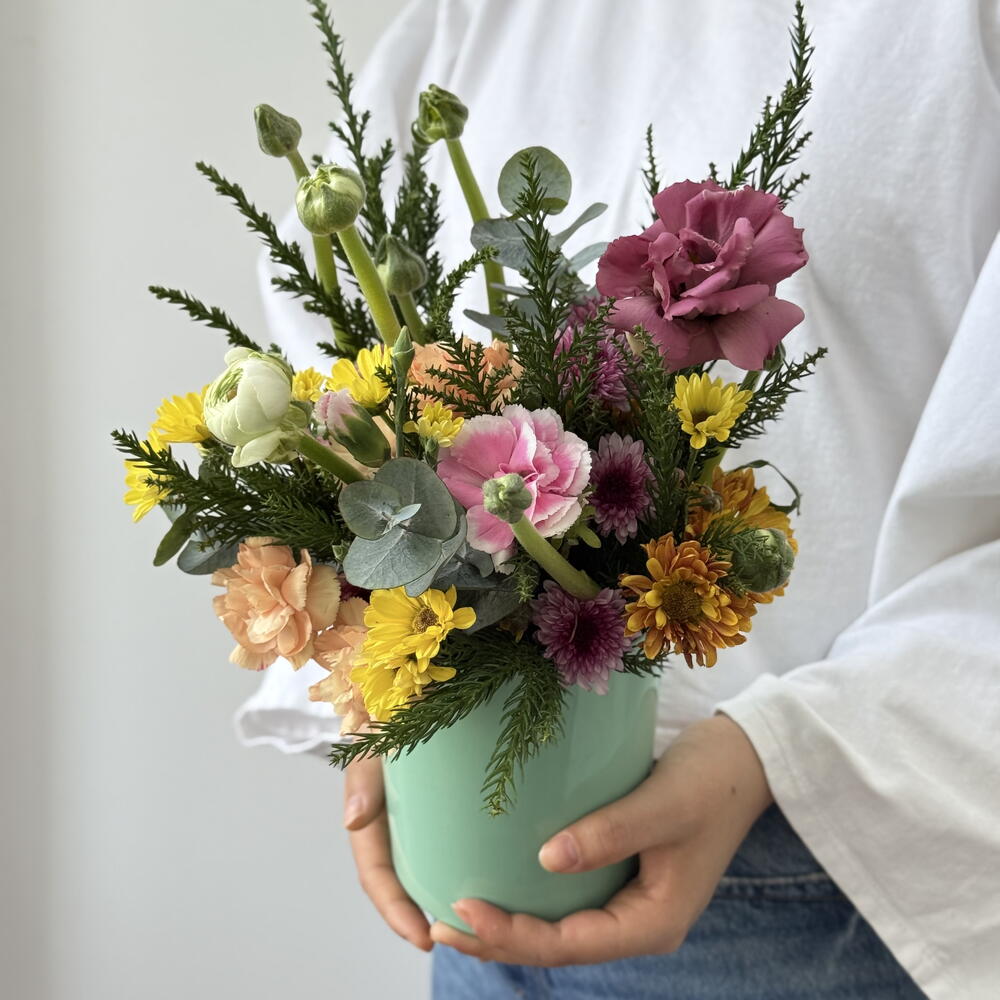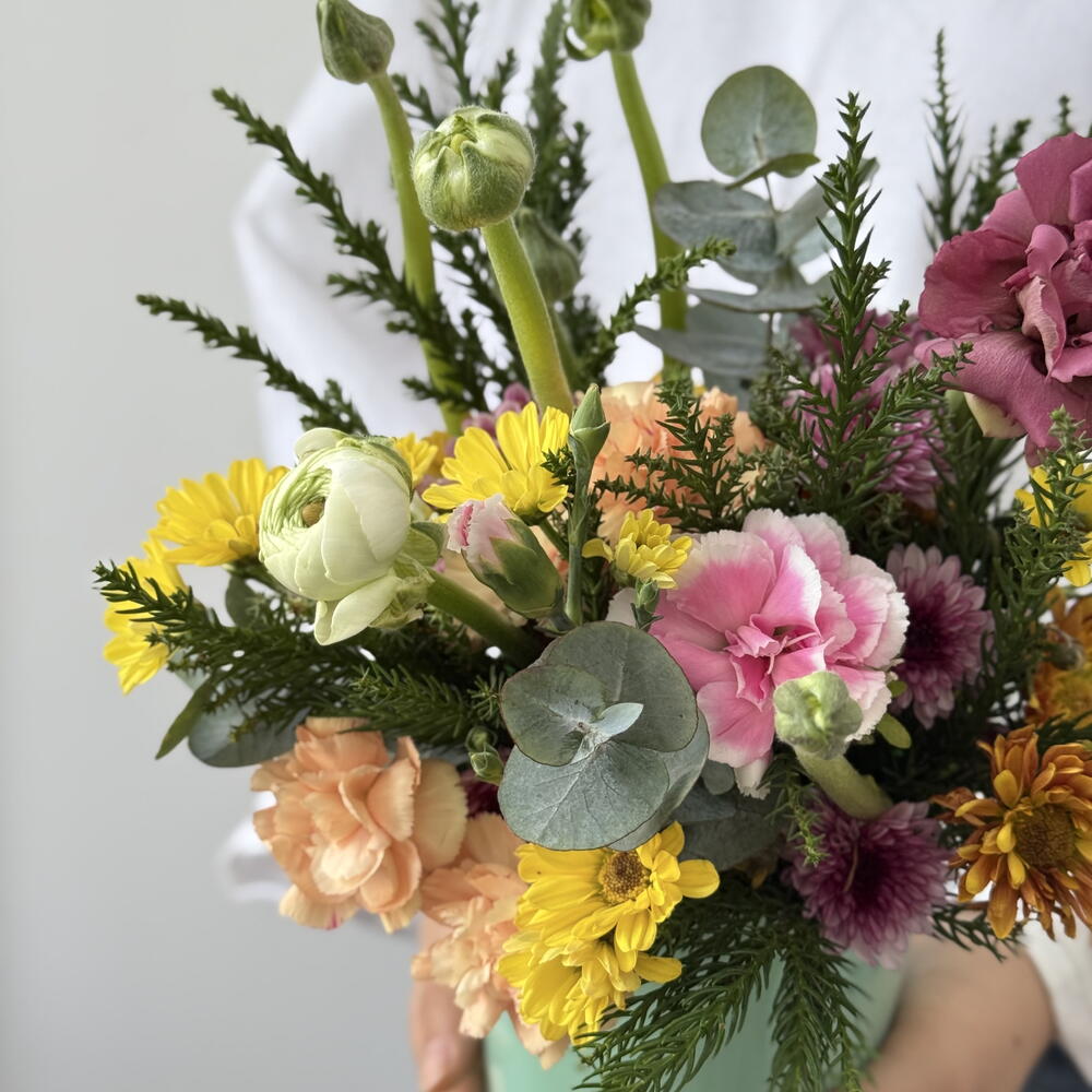 Хризантема кустовая - 2 шт. Эустома - 1 шт. Диантус кустовой - 4 шт. хвойная зелень - 5 шт.