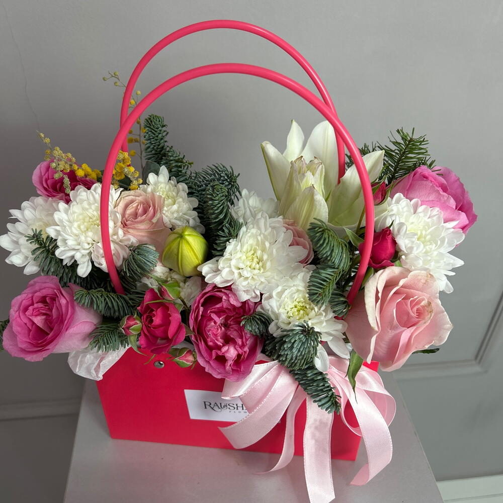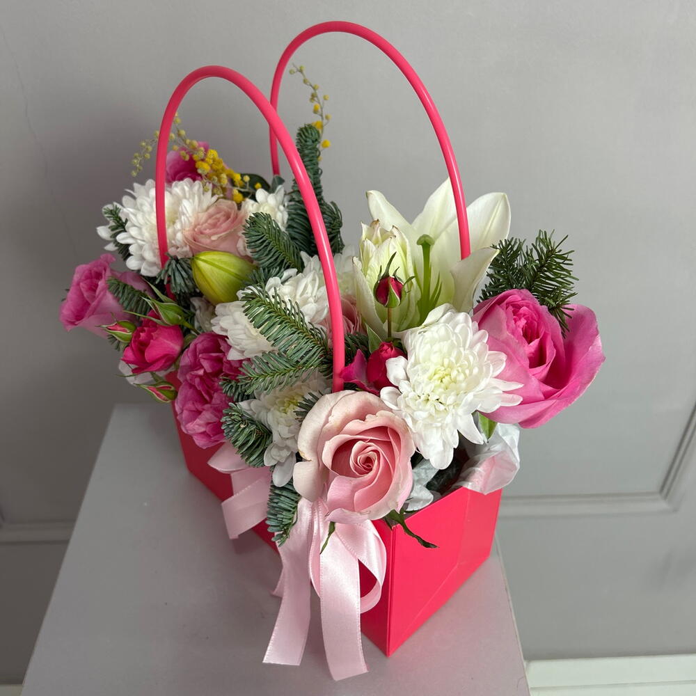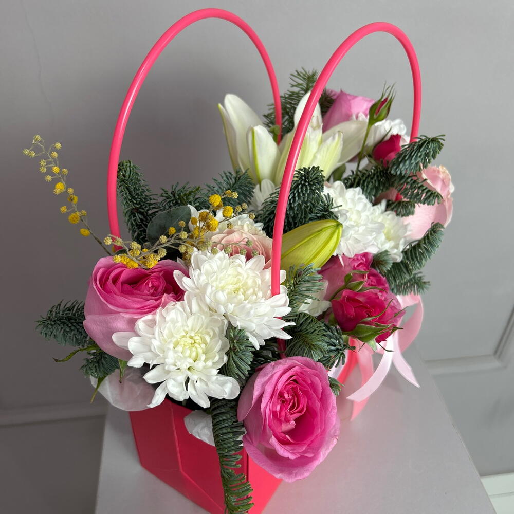 Лилия - 1 шт. Мимоза - 3 шт. Роза - 7 шт. Сумка картон - 1 шт. Нобилис - 1 шт.