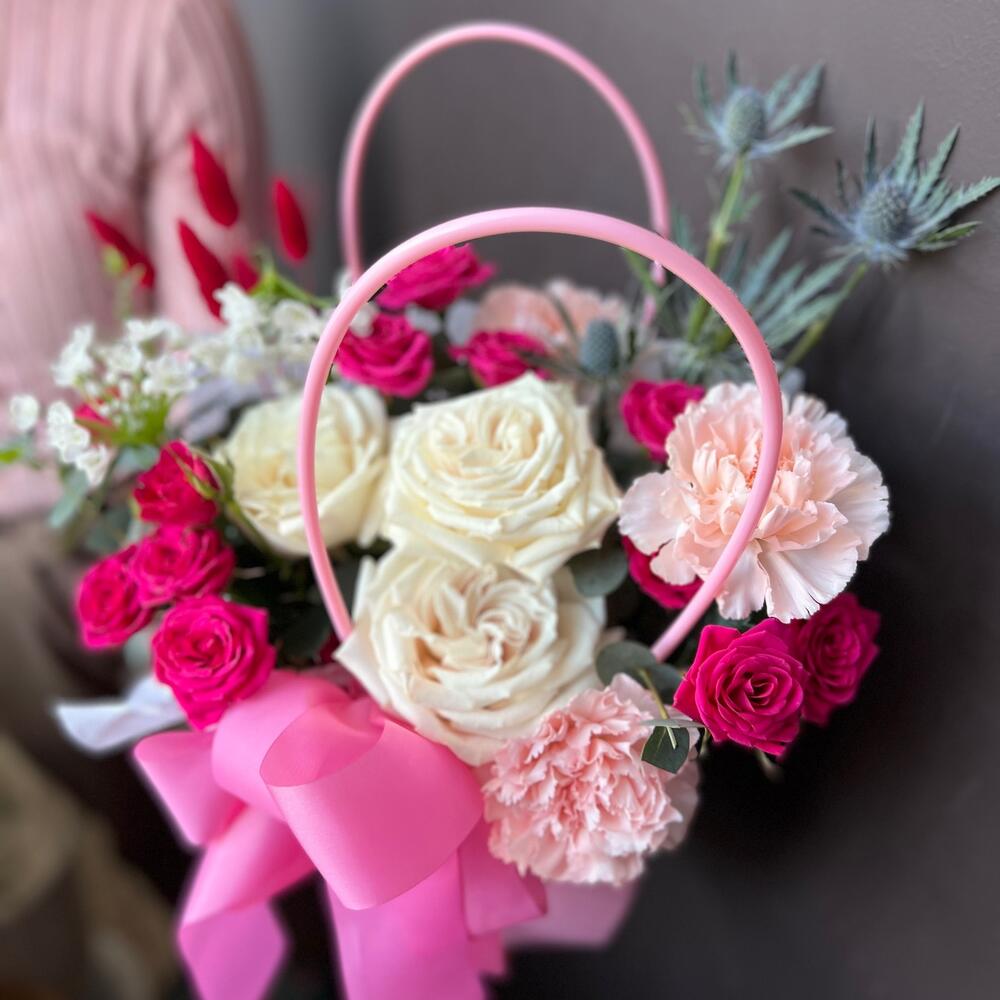 Роза кустовая - 3 шт. Эвкалипт - 1 шт. Роза - 3 шт. Диантус - 3 шт. Аллиум - 2 шт. Эрингиум Синий - 1 шт. Лагурус (сухоцвет) - 5 шт.