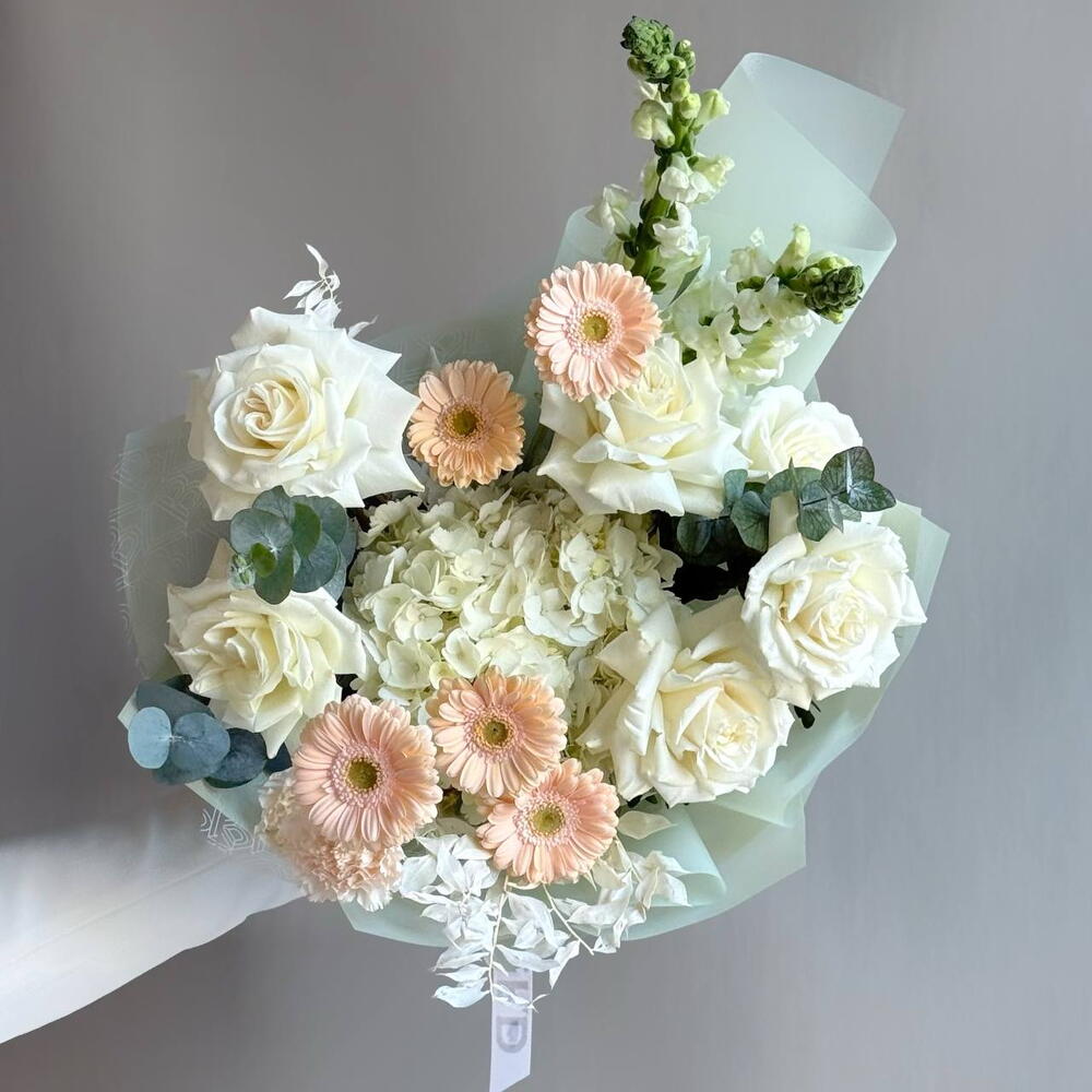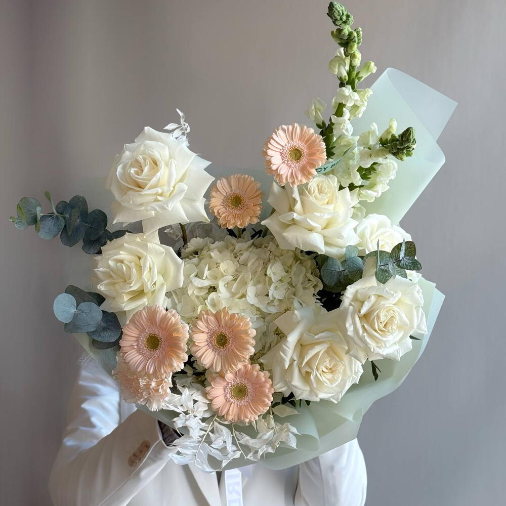 Гермини - 5 шт. Гортензия - 1 шт. Эвкалипт - 1 шт. Диантус - 2 шт. Роза пинк мондиаль - 6 шт. рускус стабилизированный - 1 шт. Антирринум - 2 шт.
