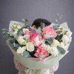 Гортензия - 1 шт. Эустома - 7 шт. Эвкалипт Цинерея - 8 шт. розы белые - 3 шт. розы розовые - 4 шт.