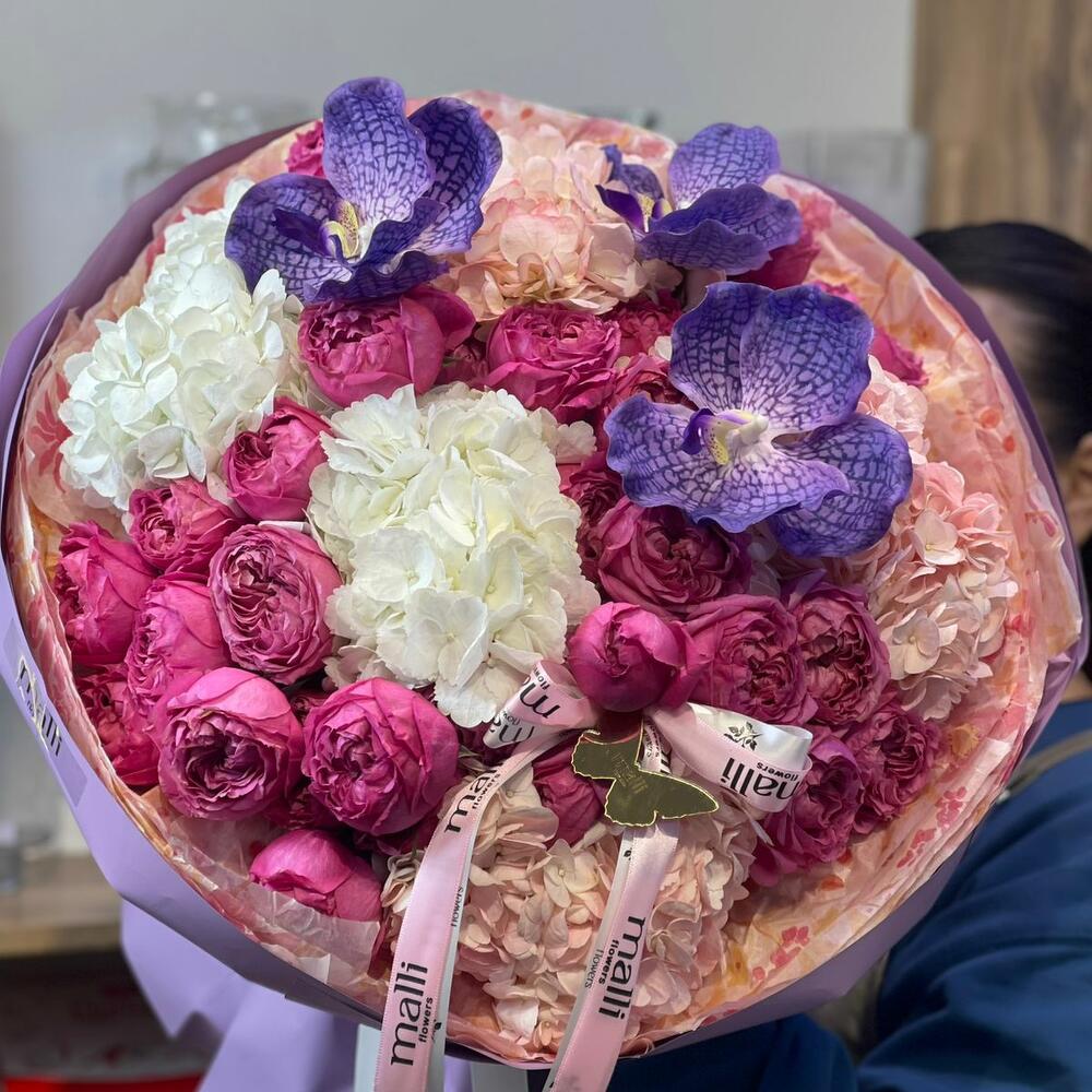 Гортензия - 5 шт. искусственная орхидея - 3 шт. пионовидные кустовые розы - 10 шт.