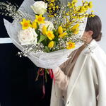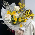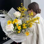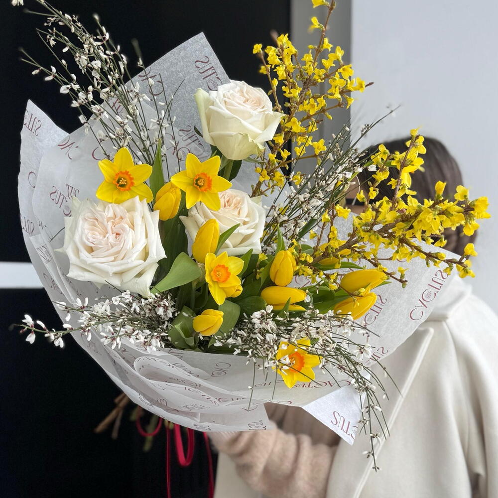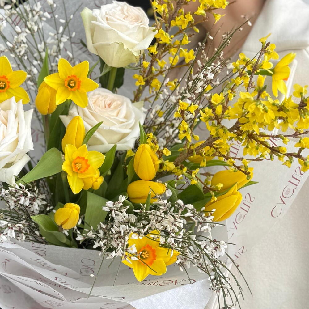Тюльпан - 9 шт. Форзиция - 2 шт. Гениста - 4 шт. Роза пионовидная охара - 3 шт. нарциссы желтые - 5 шт.