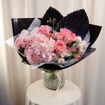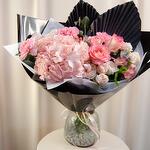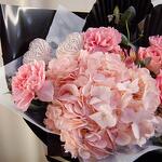 Альстромерия - 5 шт. Гортензия - 1 шт. Роза кустовая - 2 шт. Роза - 7 шт. Оформление - 1 шт. Гвоздика одноголовая - 5 шт. копьялистья из бумаги большие - 2 шт.