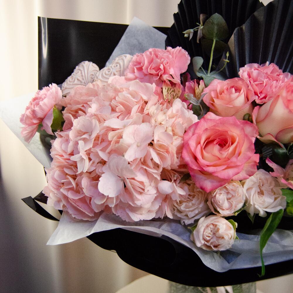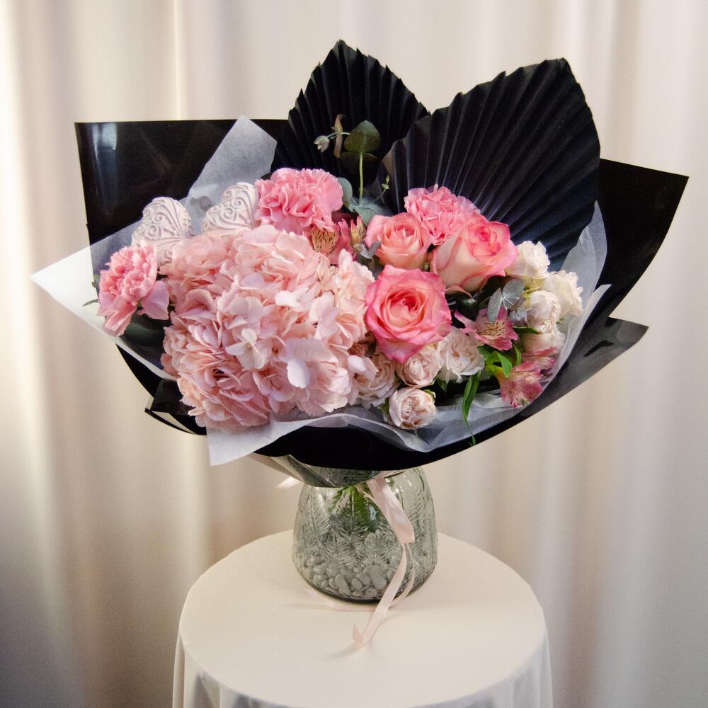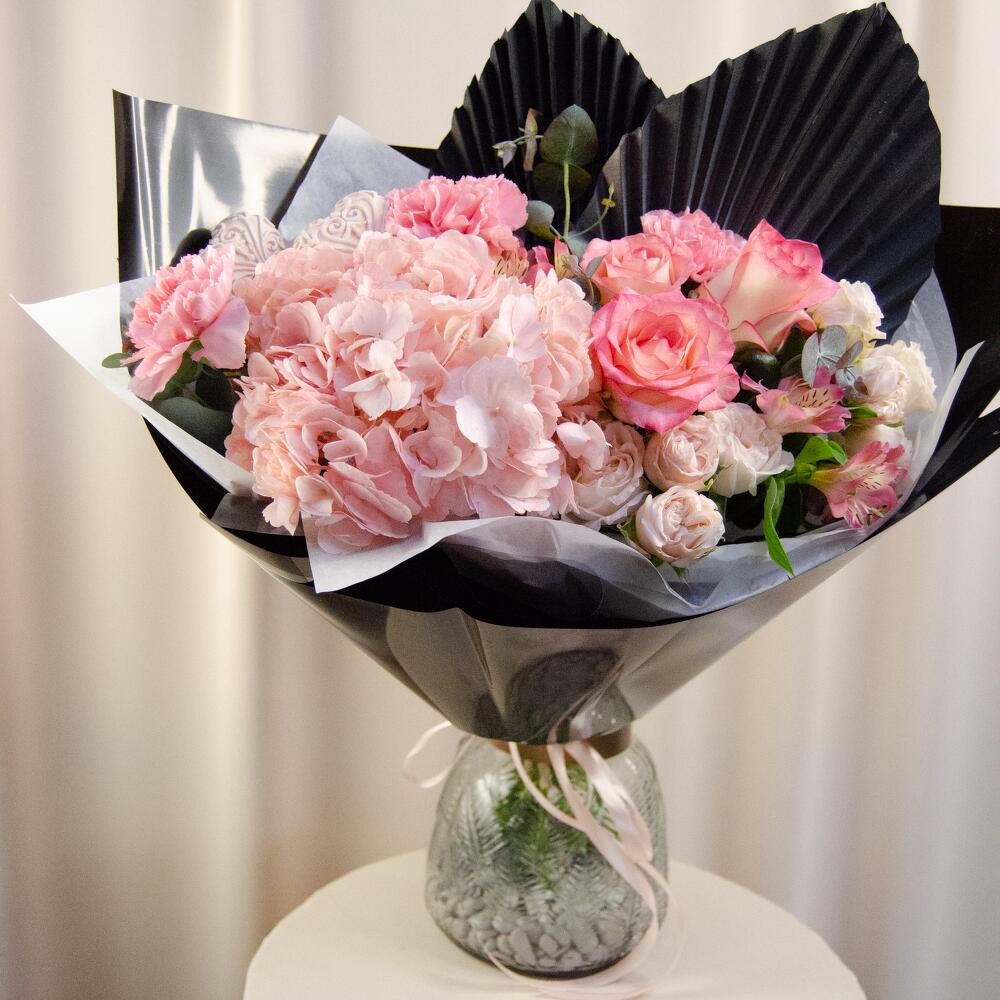 Альстромерия - 5 шт. Гортензия - 1 шт. Роза кустовая - 2 шт. Роза - 7 шт. Оформление - 1 шт. Гвоздика одноголовая - 5 шт. копьялистья из бумаги большие - 2 шт.