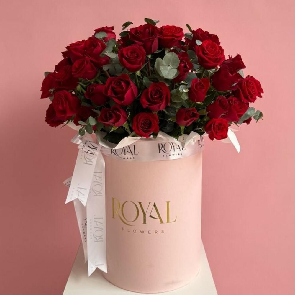 Эффектная композиция из 51 красной розы в пудрово-розовой шляпной коробке с лентами ROYAL — настоящий символ страсти и роскоши. Идеальный подарок, чтобы признаться в любви, поздравить с юбилеем или по-настоящему удивить. Композиция дополнена эвкалиптом, который придаёт свежести и стиля.
