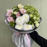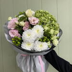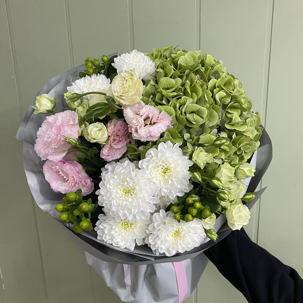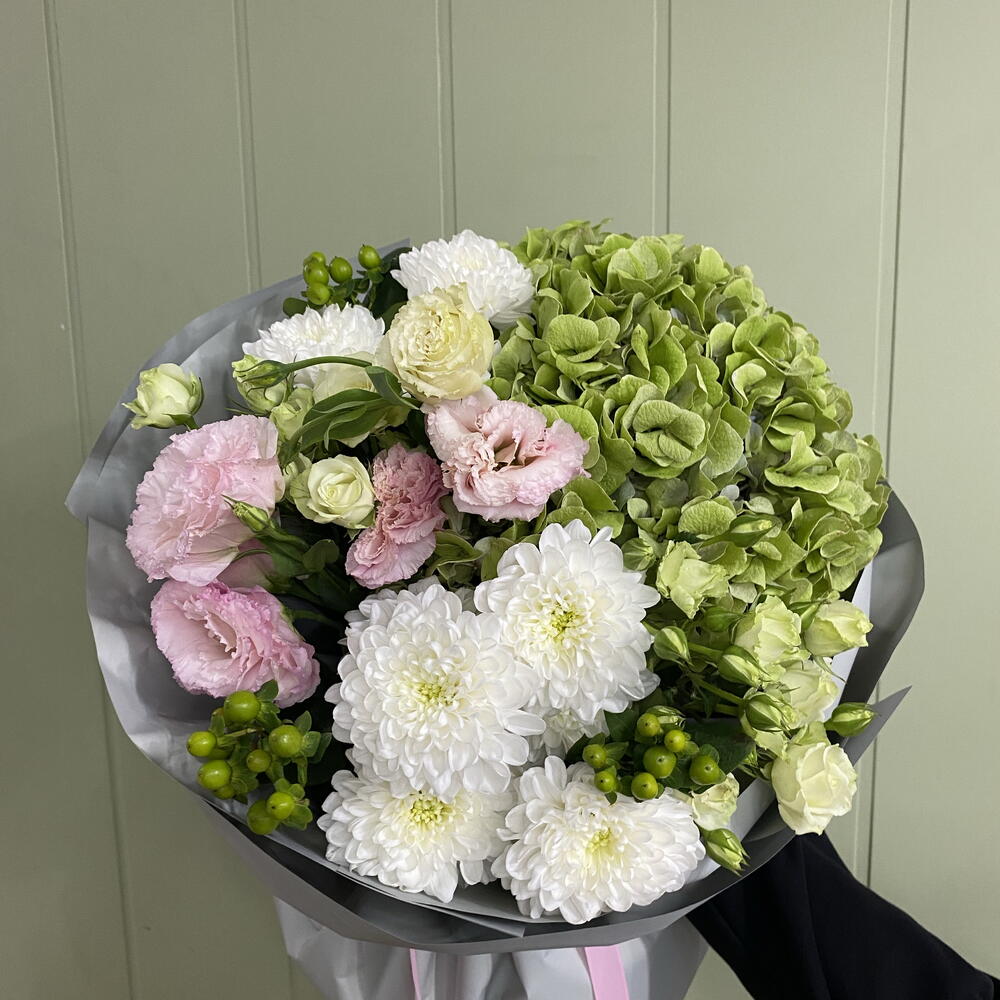 Гиперикум - 2 шт. Хризантема кустовая Белая - 2 шт. эустома розовая - 2 шт. Кустовая белая роза - 2 шт. Гортензия Премиум Микс - 1 шт.