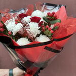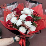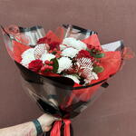 Яркий букет ко дню всех влюбленных из алых роз и белых хризантем с добавлением гиперикума.