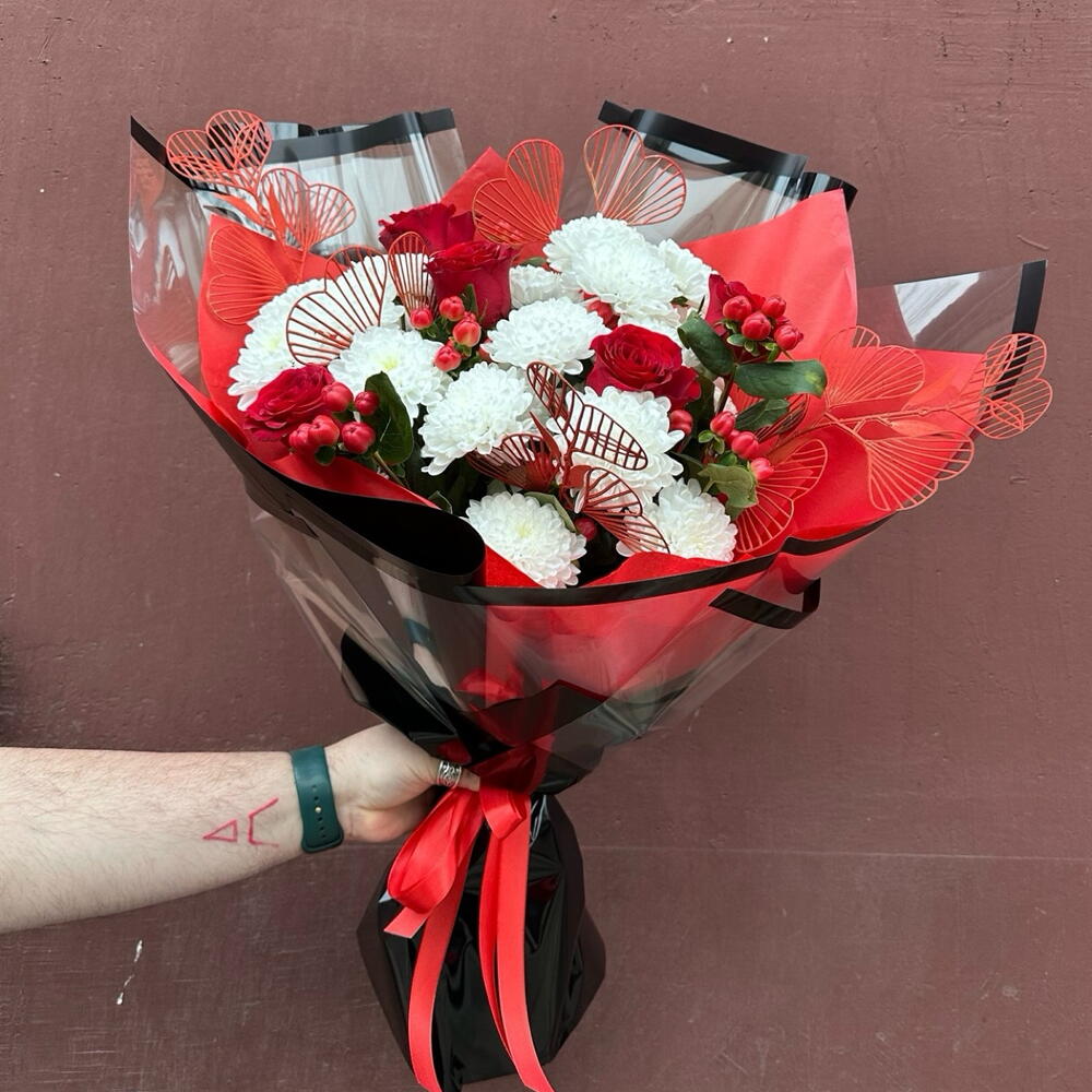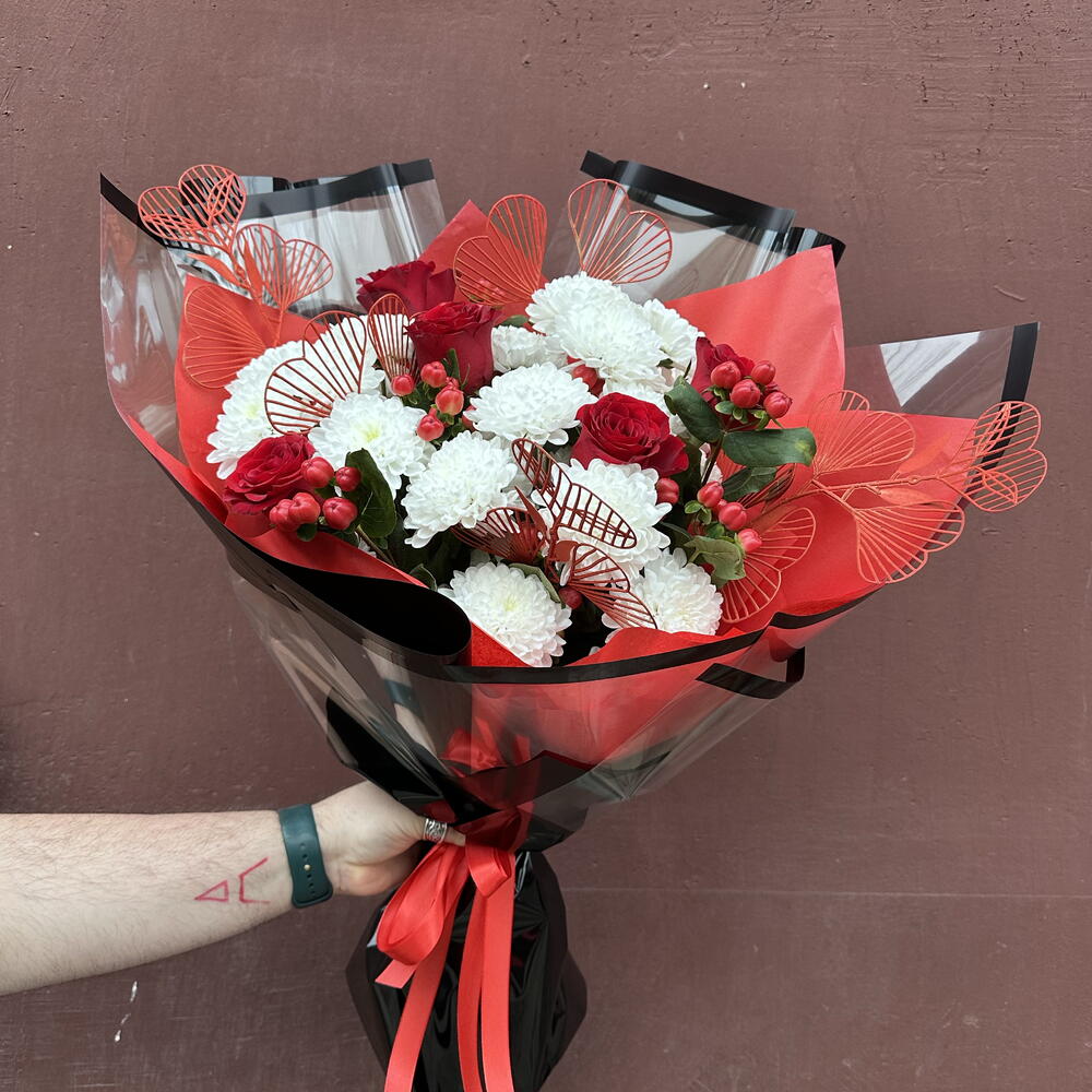 Яркий букет ко дню всех влюбленных из алых роз и белых хризантем с добавлением гиперикума.