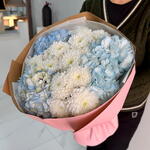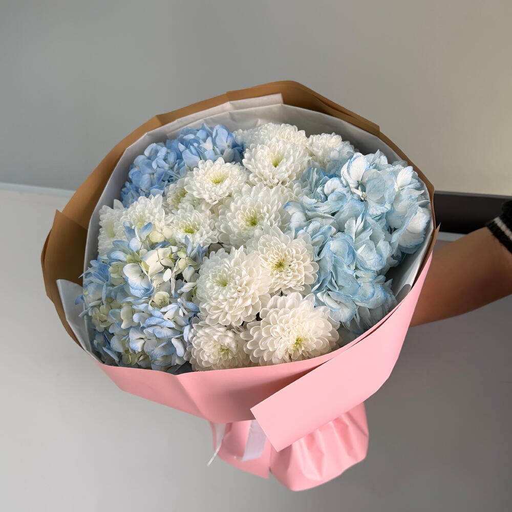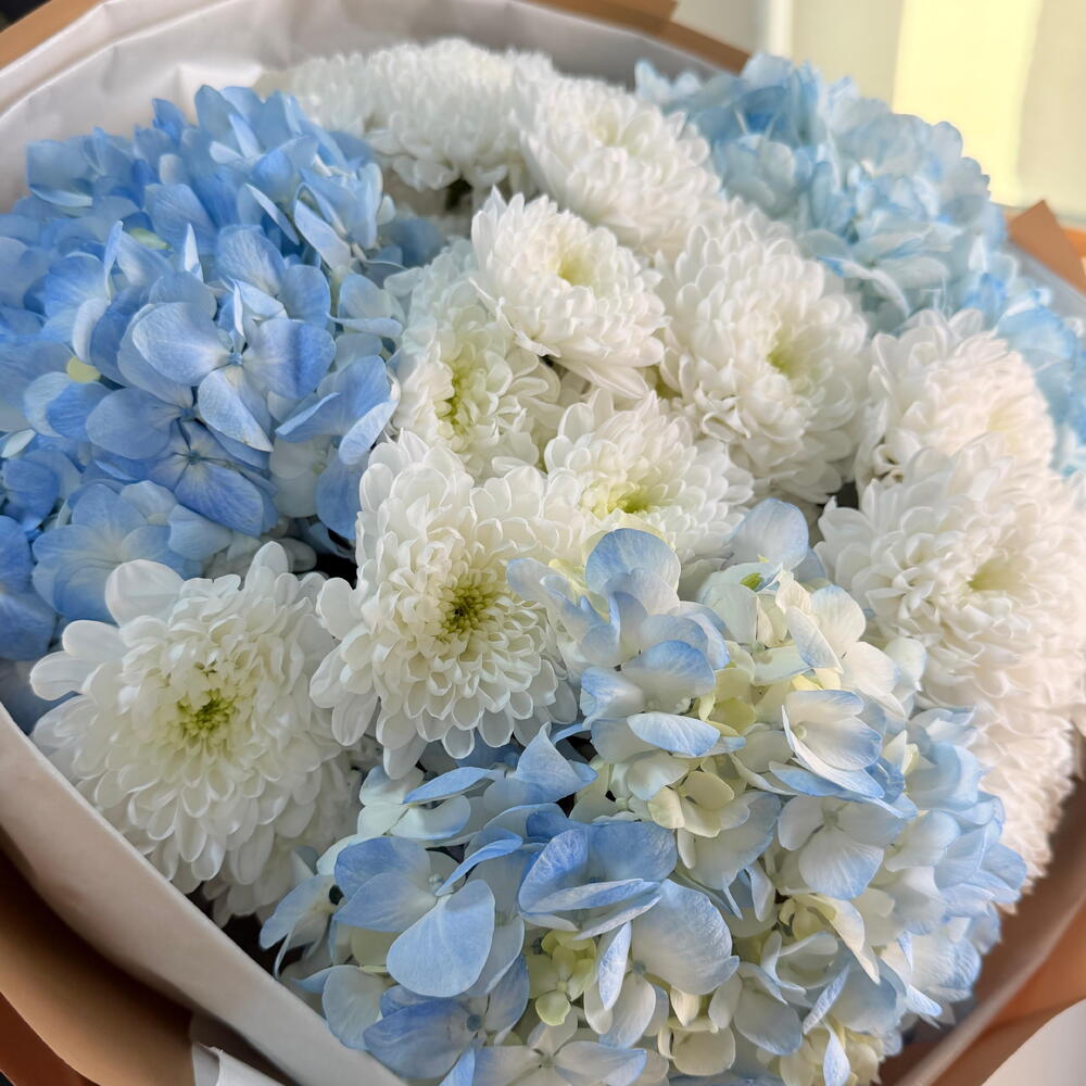 🤍 Нежность в голубых оттенках 🤍 Элегантный округлый букет из воздушных белых хризантем и нежно-голубых гортензий — идеальный выбор для тех, кто ценит стиль, чистоту и утончённость. Композиция собрана в трендовой минималистичной упаковке, подчёркивающей объём и форму букета. ✨ Символика: • белые хризантемы — искренность, уважение и светлые чувства • голубая гортензия — нежность, гармония и забота 🎁 Подойдёт для: — дня рождения — выписки — признания — благодарности — стильного комплимента без повода 📸 Букет выглядит дорого и эффектно вживую и на фото.