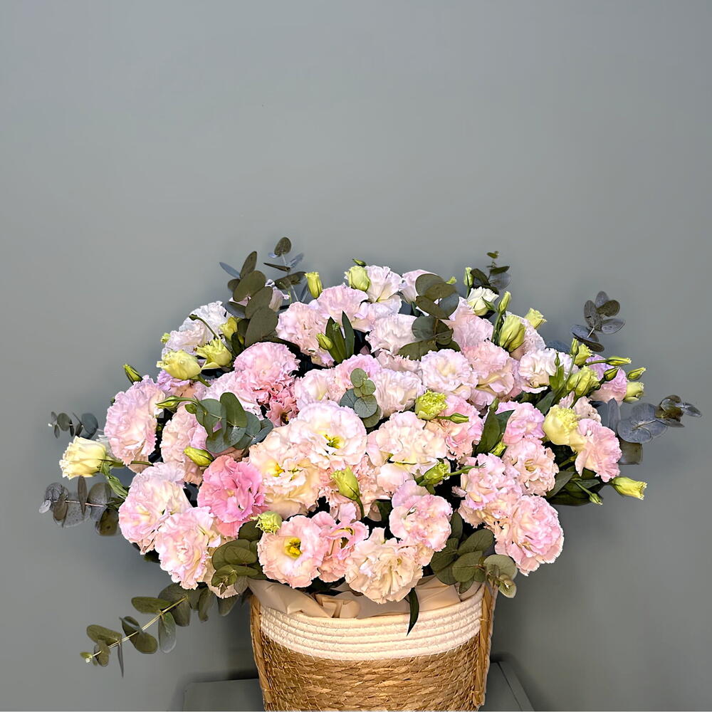Роскошная композиция из 17 изысканных лизиантусов, акцентированных пышной зеленью эвкалипта, идеально дополнит интерьер и подарит ощущение свежести. Все это изящество тщательно укомплектовано в стильное кашпо, которое подчеркивает эстетическую ценность букета. Этот подарок станет великолепным сюрпризом для любого случая.