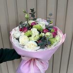 Эвкалипт - 4 шт. Роза - 9 шт. Кустовая роза - 3 шт. Гвоздика - 3 шт. Эустома - 3 шт.