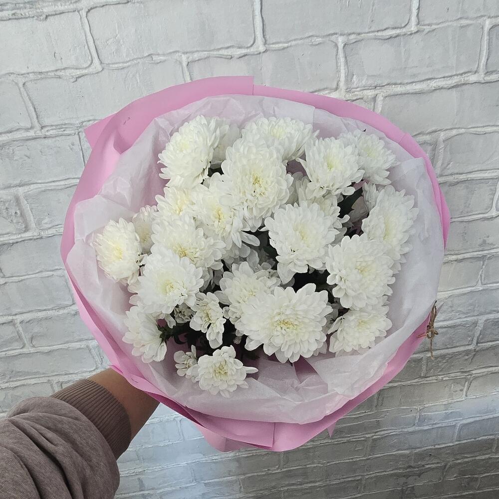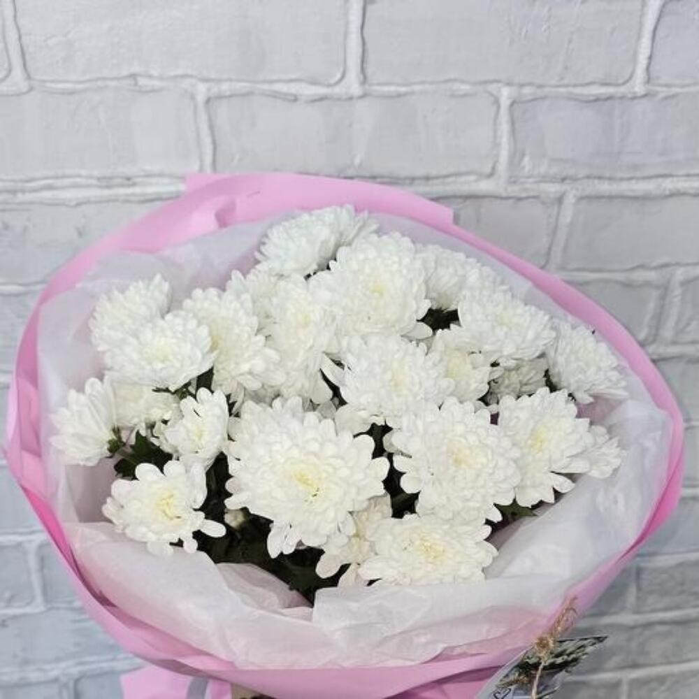 Хризантема кустовая - 5 шт. Упаковка - 1 шт. Лента атласная - 1 шт.