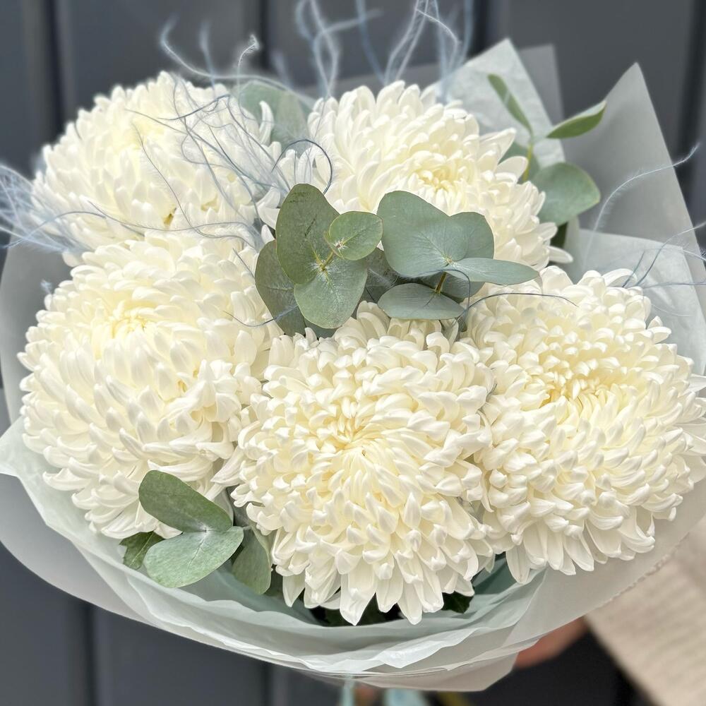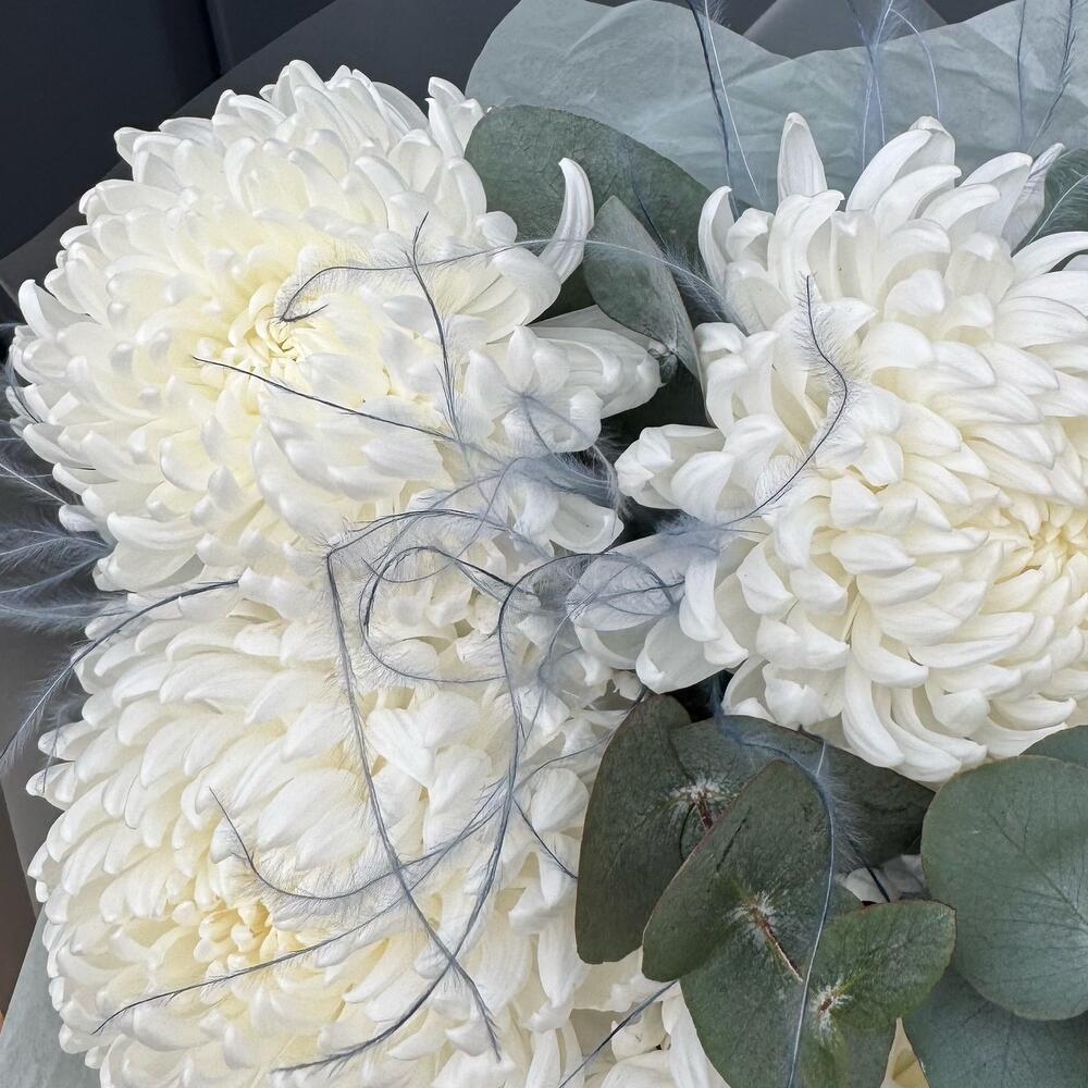 Эвкалипт - 5 шт. Стифа - 3 шт. хризантема бигуди белая - 5 шт.