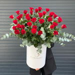 Высокие красные розы в коробке с эвкалиптом