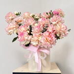 Эвкалипт - 2 шт. Коробка шляпная - 1 шт. Диантус кустовой - 4 шт. вывернутые розы эквадор - 15 шт.