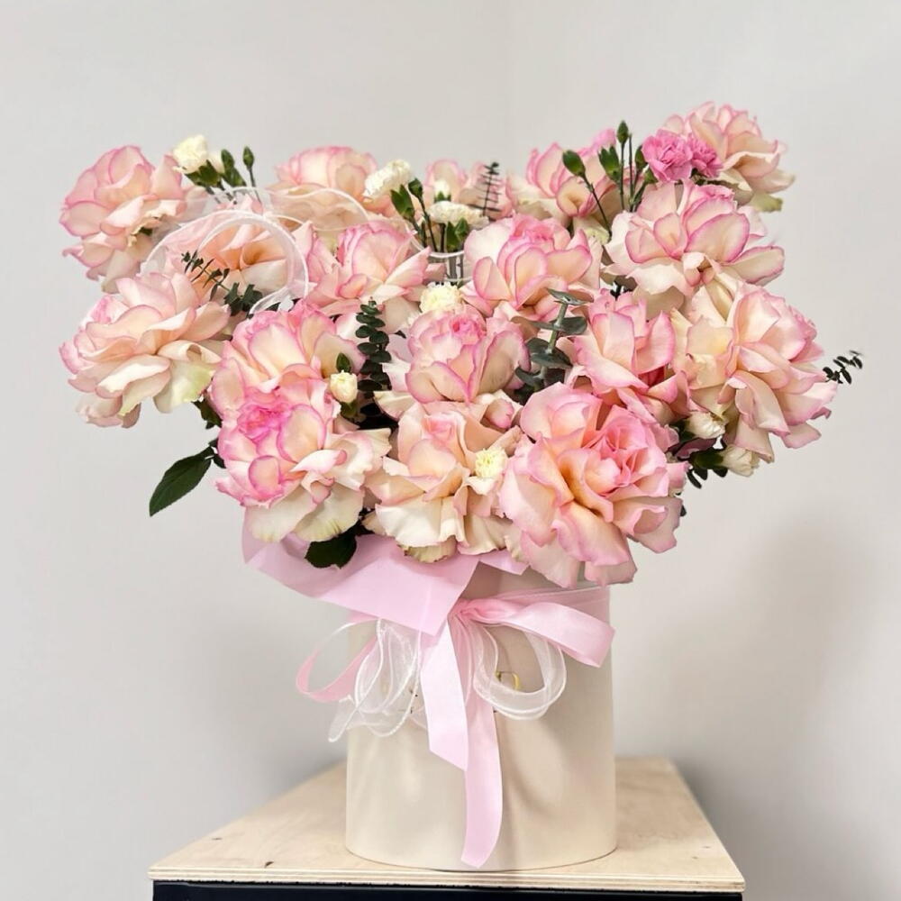 Эвкалипт - 2 шт. Коробка шляпная - 1 шт. Диантус кустовой - 4 шт. вывернутые розы эквадор - 15 шт.