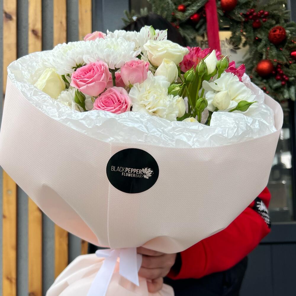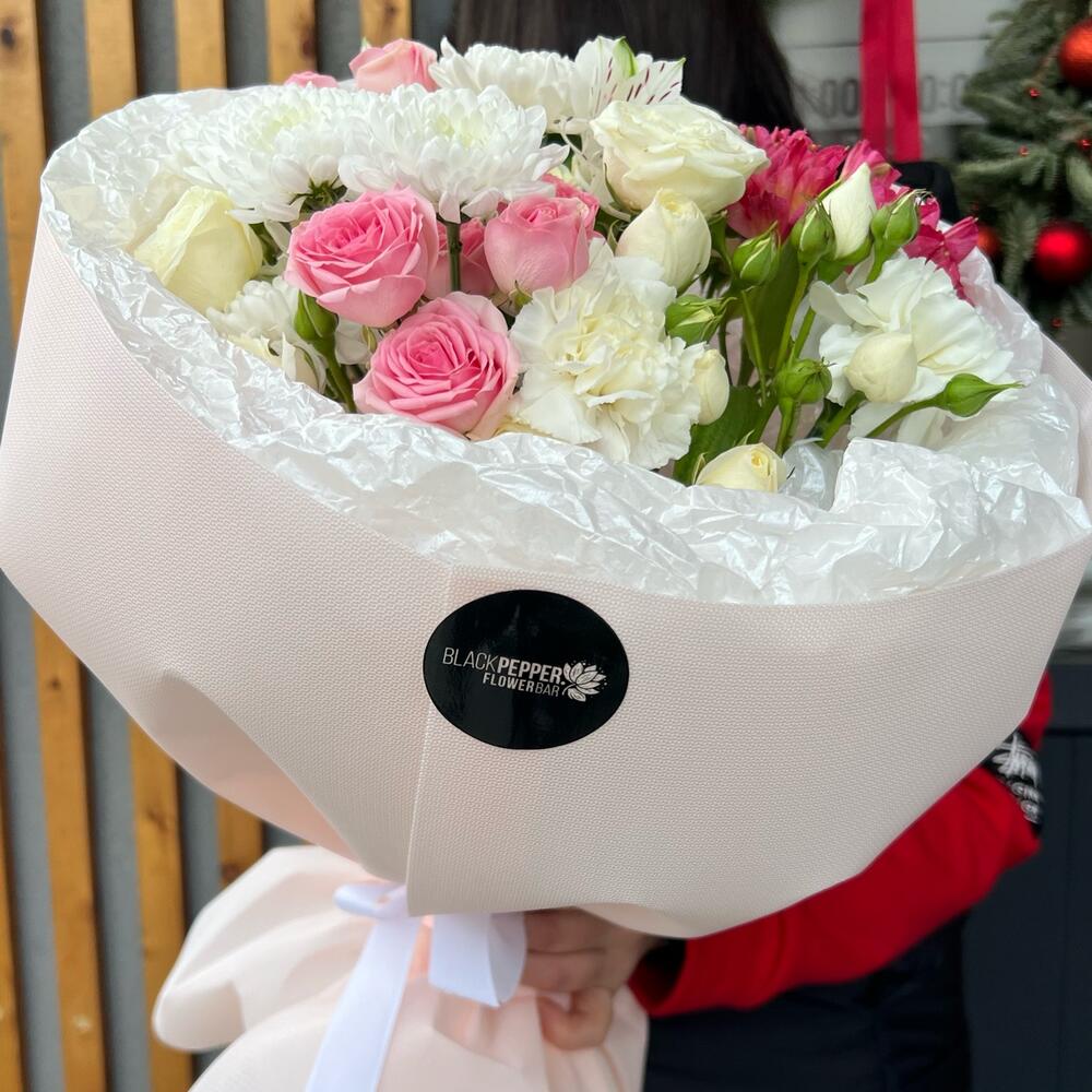 Этот авторский букет идеально соединяет в себе пышность альстромерии, изящество кустовой хризантемы, страстность кустовых роз и очарование диантуса. 8 цветов в едином ансамбле создают неповторимую гармонию оттенков и форм. Данный букет станет прекрасной изюминкой вашего праздничного события или неожиданным, но приятным сюрпризом для близкого вам человека.