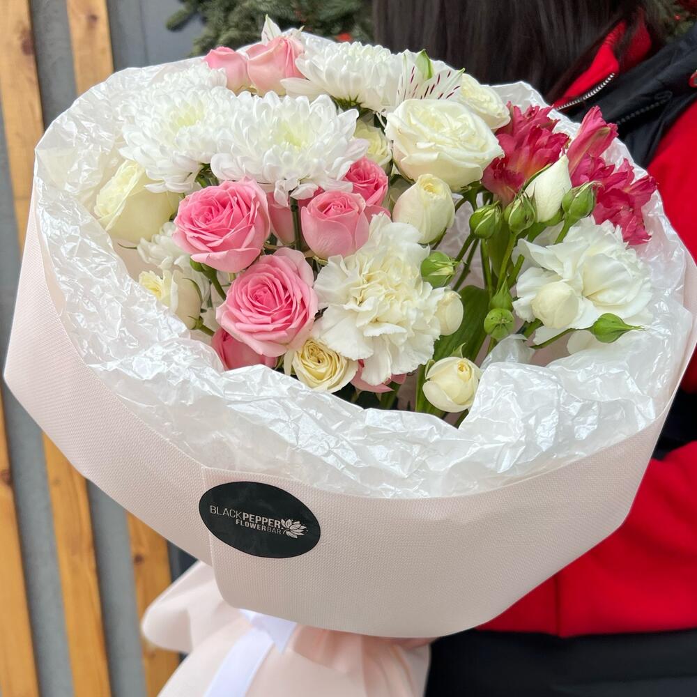 Альстромерия - 2 шт. Хризантема кустовая - 1 шт. Кустовая роза - 3 шт. Диантус - 2 шт.