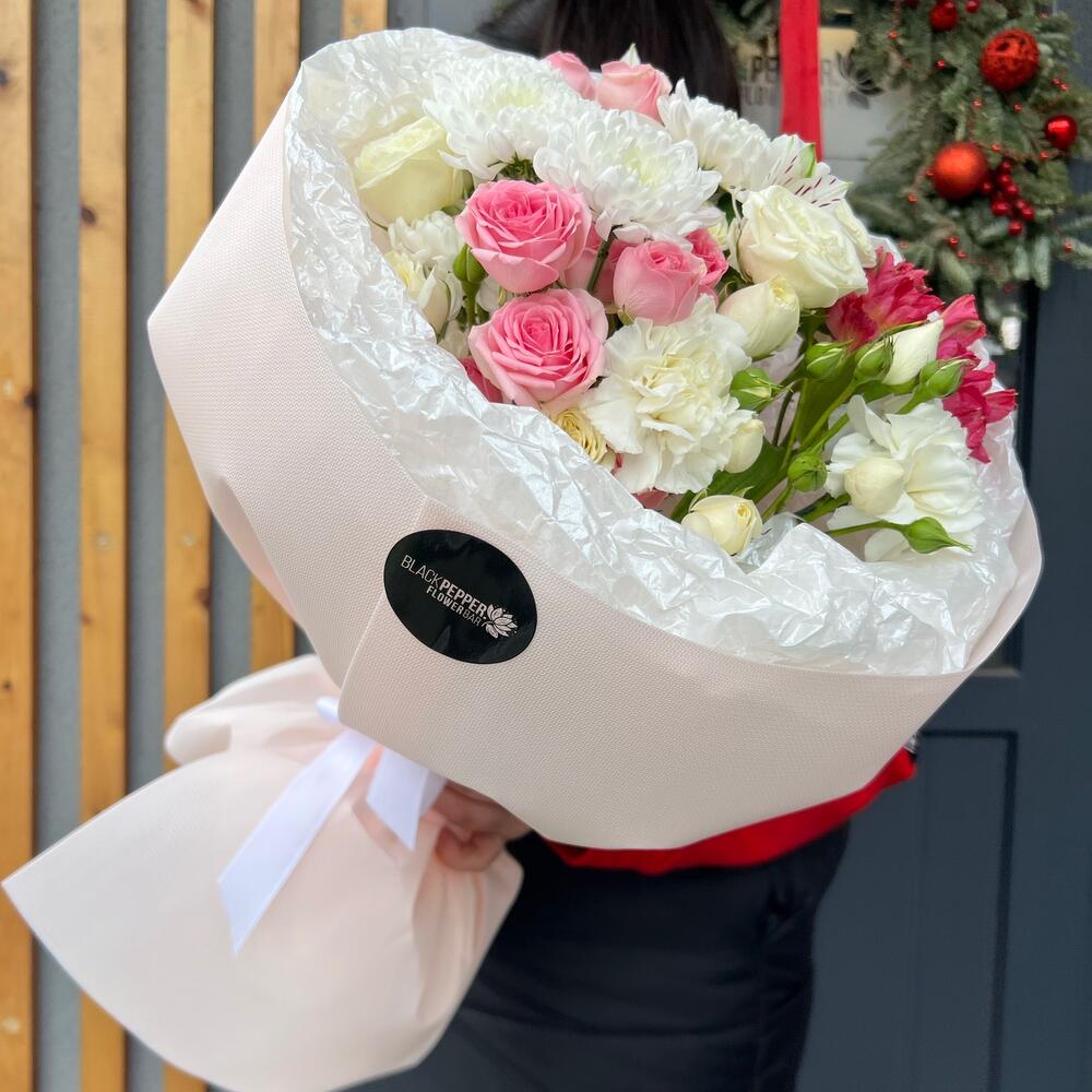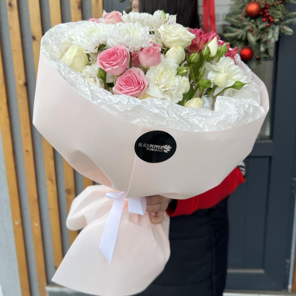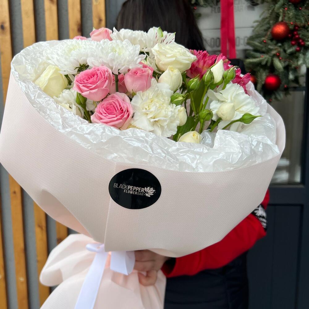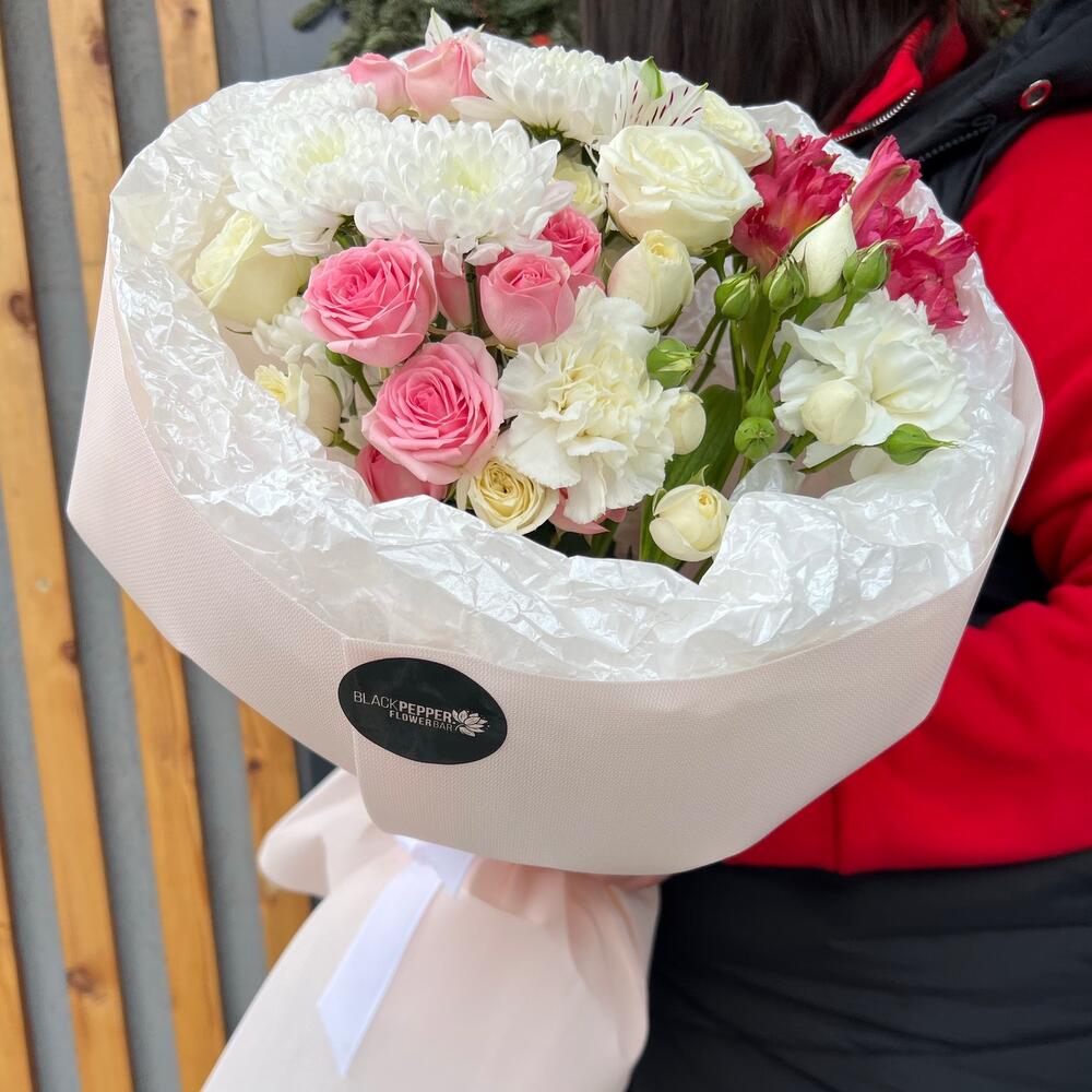 Альстромерия - 2 шт. Хризантема кустовая - 1 шт. Кустовая роза - 3 шт. Диантус - 2 шт.