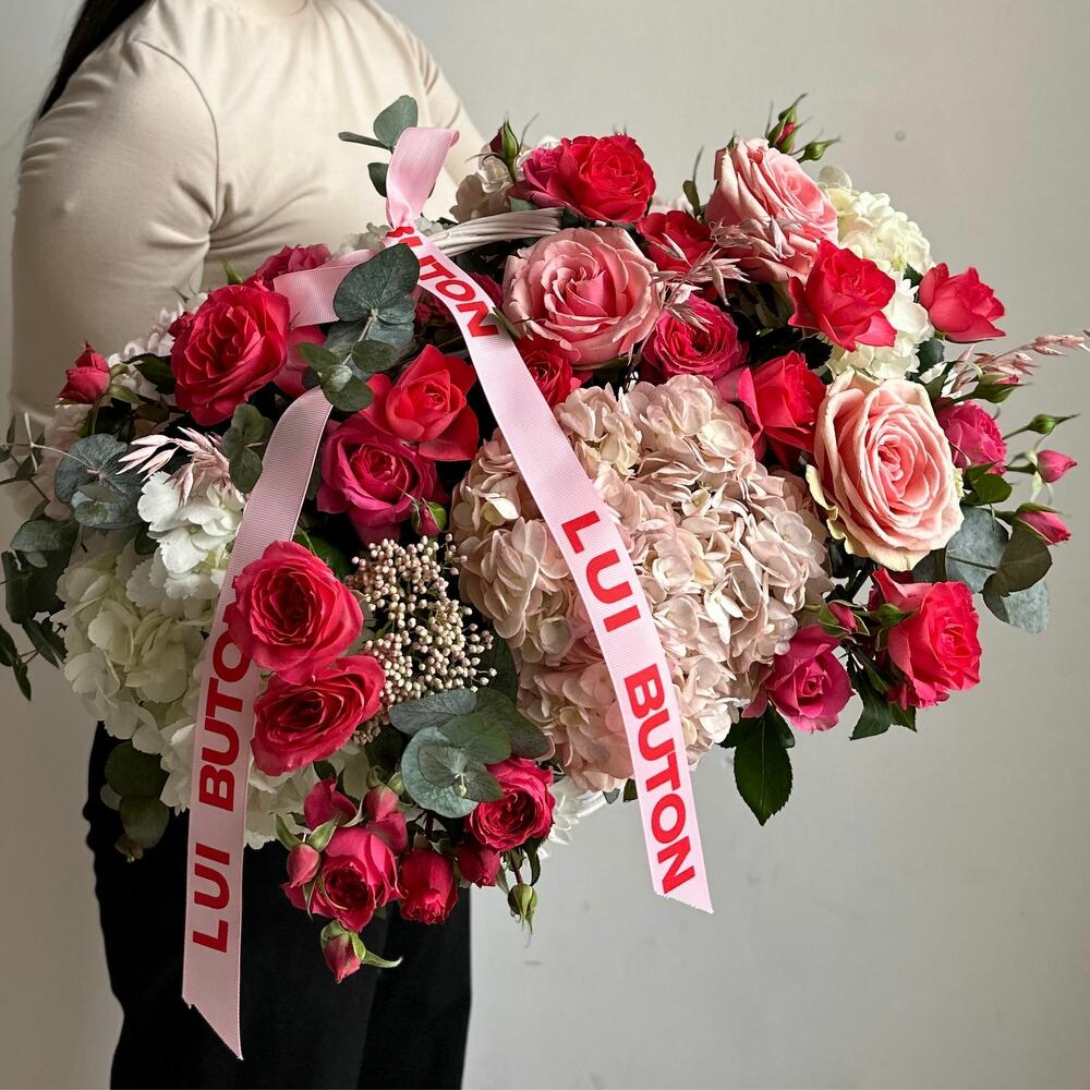 Озотамнус - 1 шт. Эвкалипт - 3 шт. гортензии - 5 шт. голландские розы - 3 шт. кустовые розы - 7 шт.
