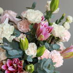 Лилия - 4 шт. Гвоздика - 45 шт. Эустома - 26 шт. Хризантема одноголовая - 5 шт. пионовидные розы - 31 шт.