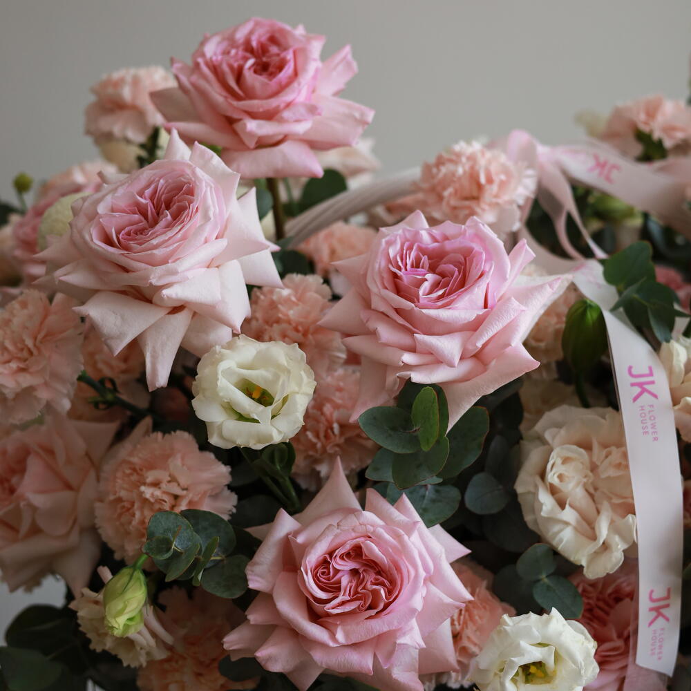 Лилия - 4 шт. Гвоздика - 45 шт. Эустома - 26 шт. Хризантема одноголовая - 5 шт. пионовидные розы - 31 шт.