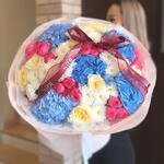 Этот букет — воплощение гармонии и радости! Насыщенные синие гортензии создают основу композиции, нежные кремовые и солнечные жёлтые розы добавляют мягкости и тепла, а яркие розовые акценты наполняют букет энергией и страстью. Белоснежные хризантемы вносят лёгкость и воздушность, подчеркивая изящество всего ансамбля. Такой букет станет великолепным подарком для самых дорогих и близких, будь то день рождения, годовщина или знак благодарности. Рекомендации по уходу: поставьте букет в высокую вазу с прохладной водой, подрезайте стебли под углом каждые 2 дня, меняйте воду и избегайте прямого солнца и сквозняков.