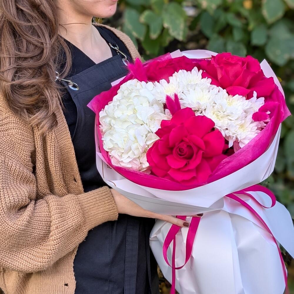 Яркий букет с гортензией и розами "Ягода-малина" S