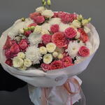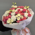 Эустома - 3 шт. роза пинк экспрешн - 5 шт. хризантема алтай - 4 шт. спрей роза white bubble - 7 шт. спрей роза prince yanzhi - 5 шт.