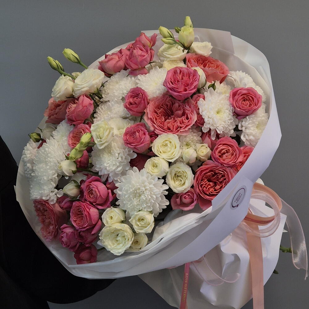 Эустома - 3 шт. роза пинк экспрешн - 5 шт. хризантема алтай - 4 шт. спрей роза white bubble - 7 шт. спрей роза prince yanzhi - 5 шт.