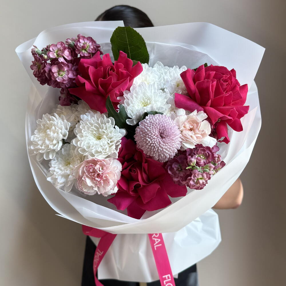 Маттиола - 2 шт. Роза - 3 шт. Гвоздика - 2 шт. Хризантема одноголовая - 1 шт. хризантема премиум - 2 шт.