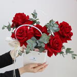 Букет в сумочке: голландские розы и аромат эвкалипта Этот букет – идеальное сочетание изысканности и свежести. Пять вывернутых голландских роз с крупными, идеально раскрытыми лепестками олицетворяют утончённую элегантность. Их нежная красота дополнена обилием приятно пахнущего эвкалипта, который придаёт композиции лёгкость и аромат природы. Удобная сумочка превращает этот букет в стильный аксессуар, готовый покорять сердца. Он станет отличным подарком для тех, кто ценит красоту и детали. Выберите этот букет, чтобы подарить не только цветы, но и атмосферу утончённого комфорта и свежести!