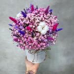 Лаванда (сухоцвет) - 15 шт. Хлопок - 3 шт. Коробка шляпная - 1 шт. Лагурус - 10 шт. Оазис флористический - 1 шт. гипсофила цветная - 7 шт.