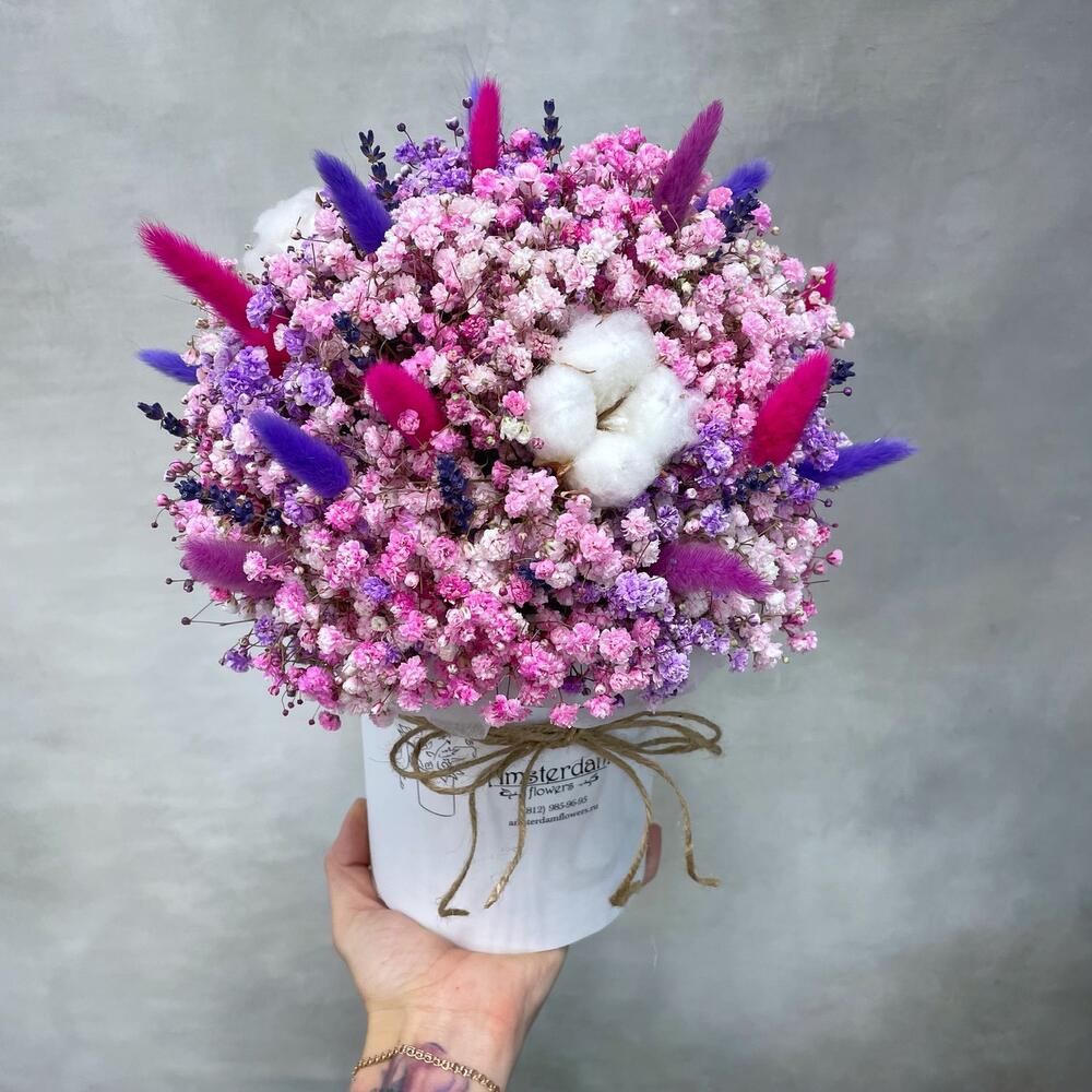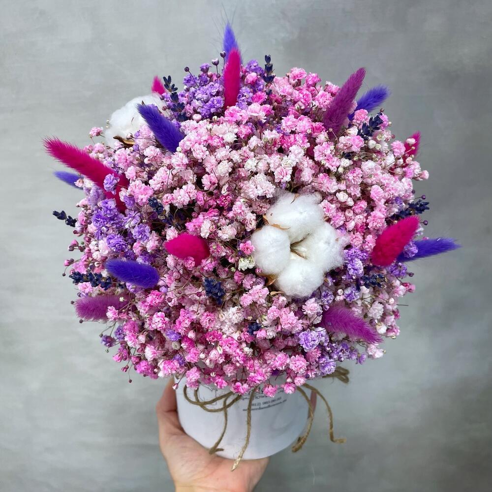 Лаванда (сухоцвет) - 15 шт. Хлопок - 3 шт. Коробка шляпная - 1 шт. Лагурус - 10 шт. Оазис флористический - 1 шт. гипсофила цветная - 7 шт.