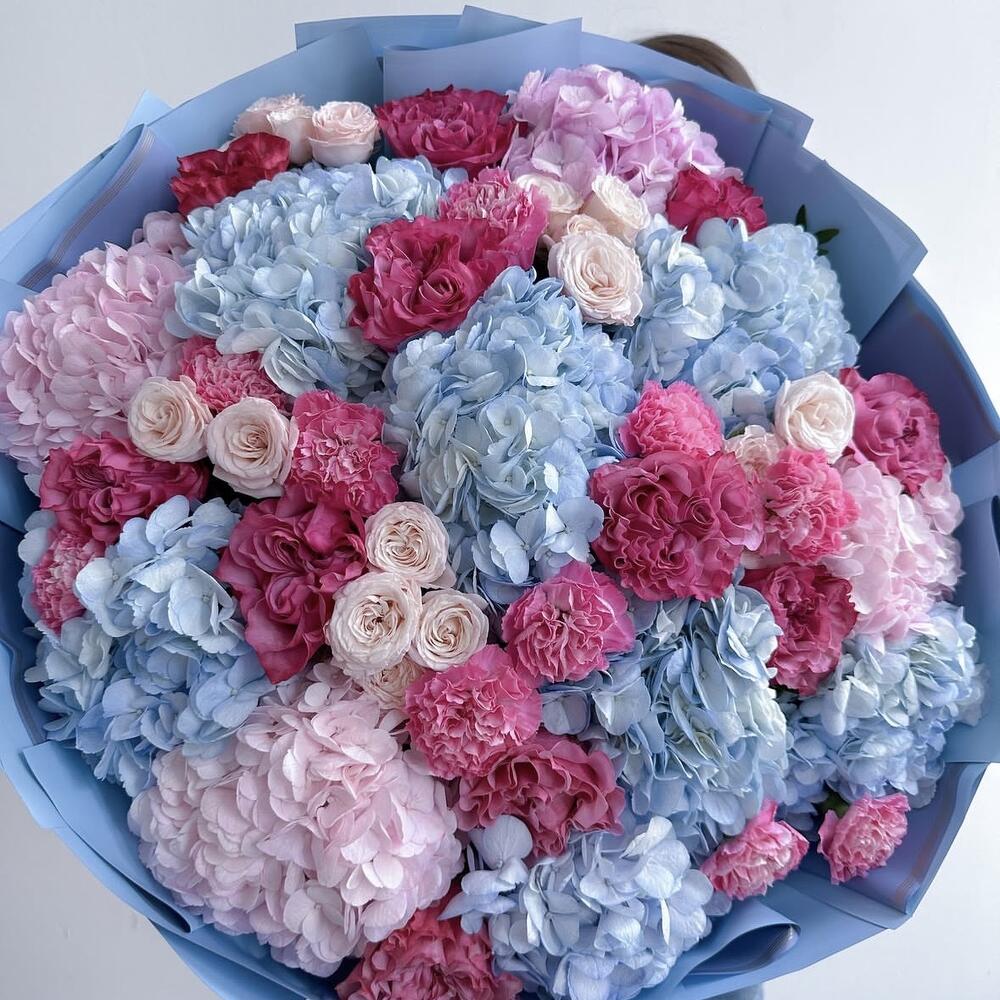 Гортензия - 11 шт. Кустовая роза - 5 шт. Диантус - 10 шт. Роза пионовидная - 10 шт.