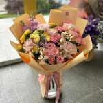Альстромерия - 3 шт. Маттиола - 3 шт. Спрей роза - 6 шт. Гвоздика одноголовая - 3 шт. розы эквадор - 5 шт.