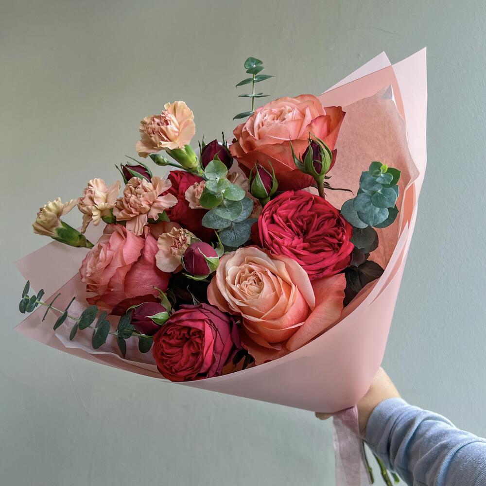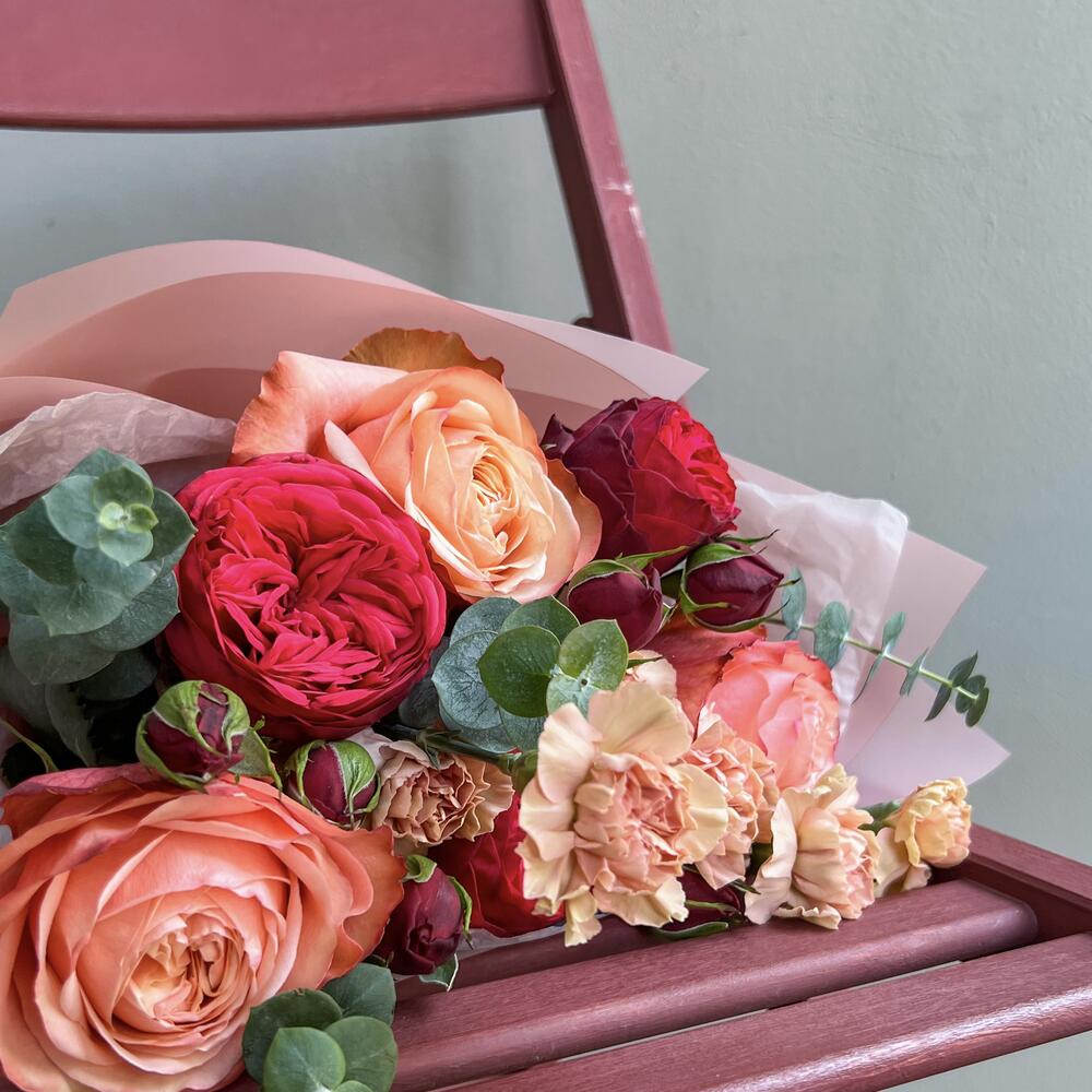 Эвкалипт - 1 шт. Диантус кустовой - 3 шт. Роза red piano - 3 шт. Роза кахала - 3 шт.