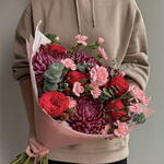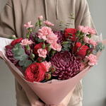 Эвкалипт - 1 шт. Диантус кустовой - 7 шт. Роза пионовидная Red Piano - 7 шт. хризантема бигуди - 5 шт.