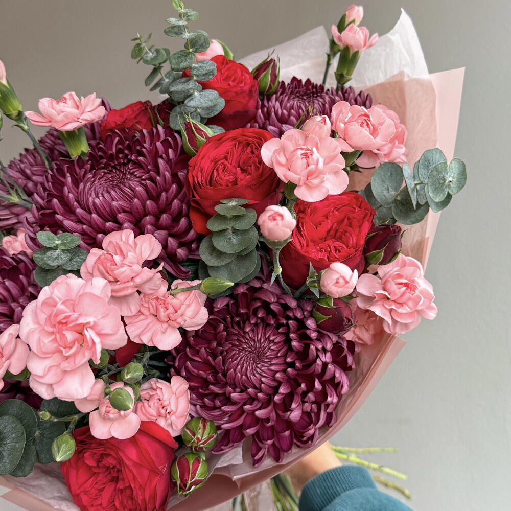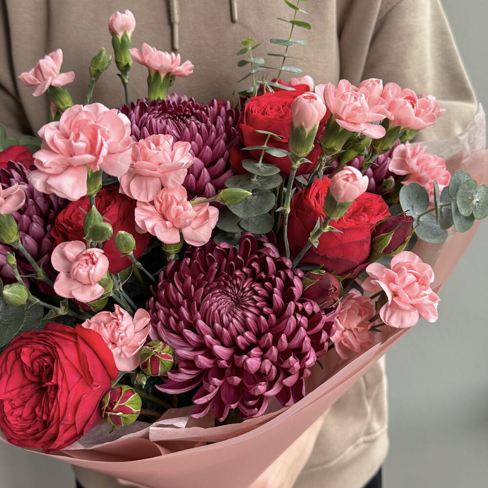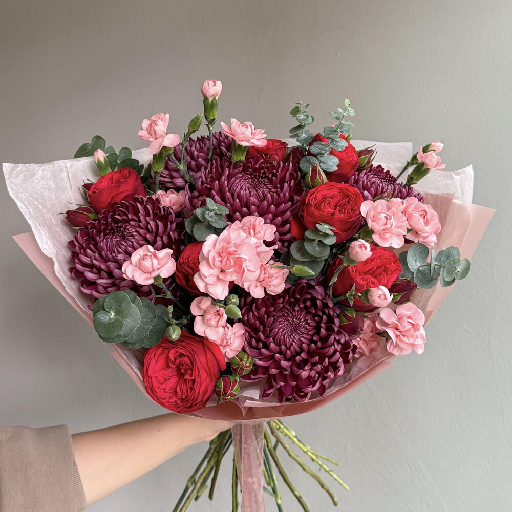 Эвкалипт - 1 шт. Диантус кустовой - 7 шт. Роза пионовидная Red Piano - 7 шт. хризантема бигуди - 5 шт.