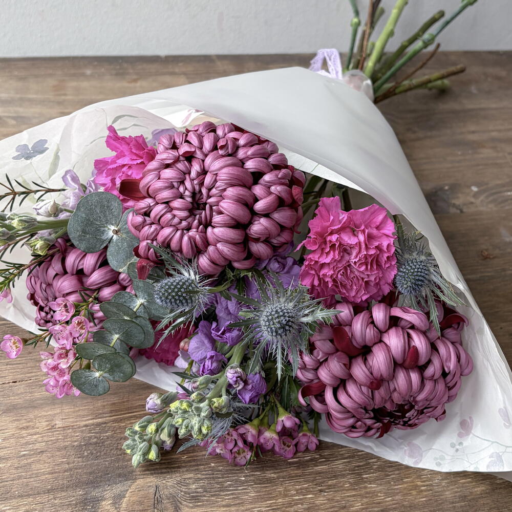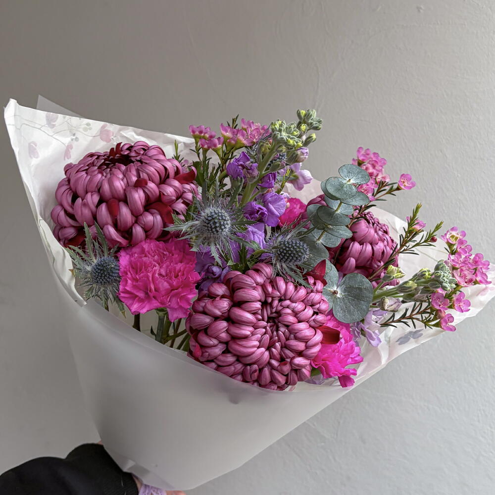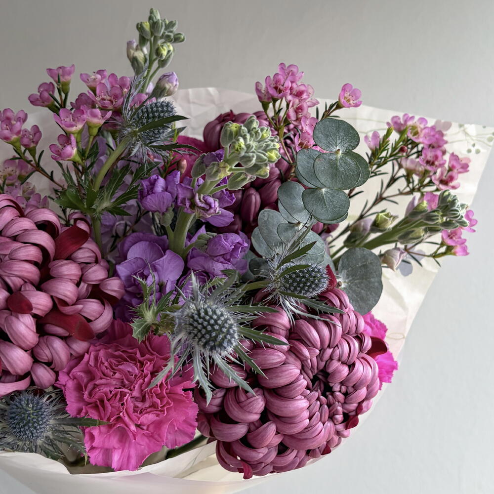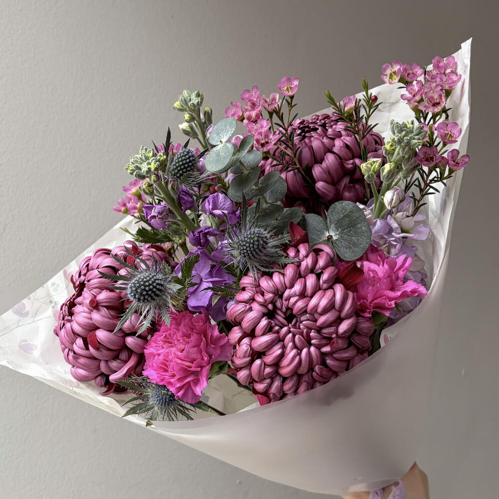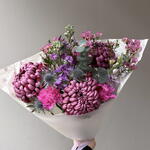 Маттиола - 3 шт. Хризантема - 3 шт. Диантус - 3 шт. шамелациум - 2 шт. эвкалипт бейби - 1 шт. эрингинум - 1 шт.