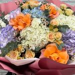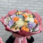 Ваксфлауэр - 3 шт. Гортензия - 15 шт. Лента - 2 шт. Эвкалипт - 3 шт. Роза - 7 шт. Упаковка - 8 шт. Спрей роза - 3 шт.