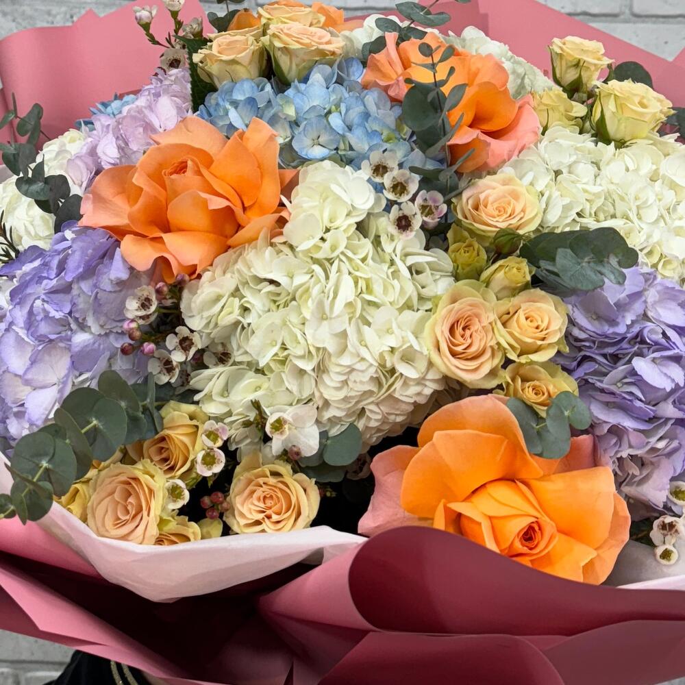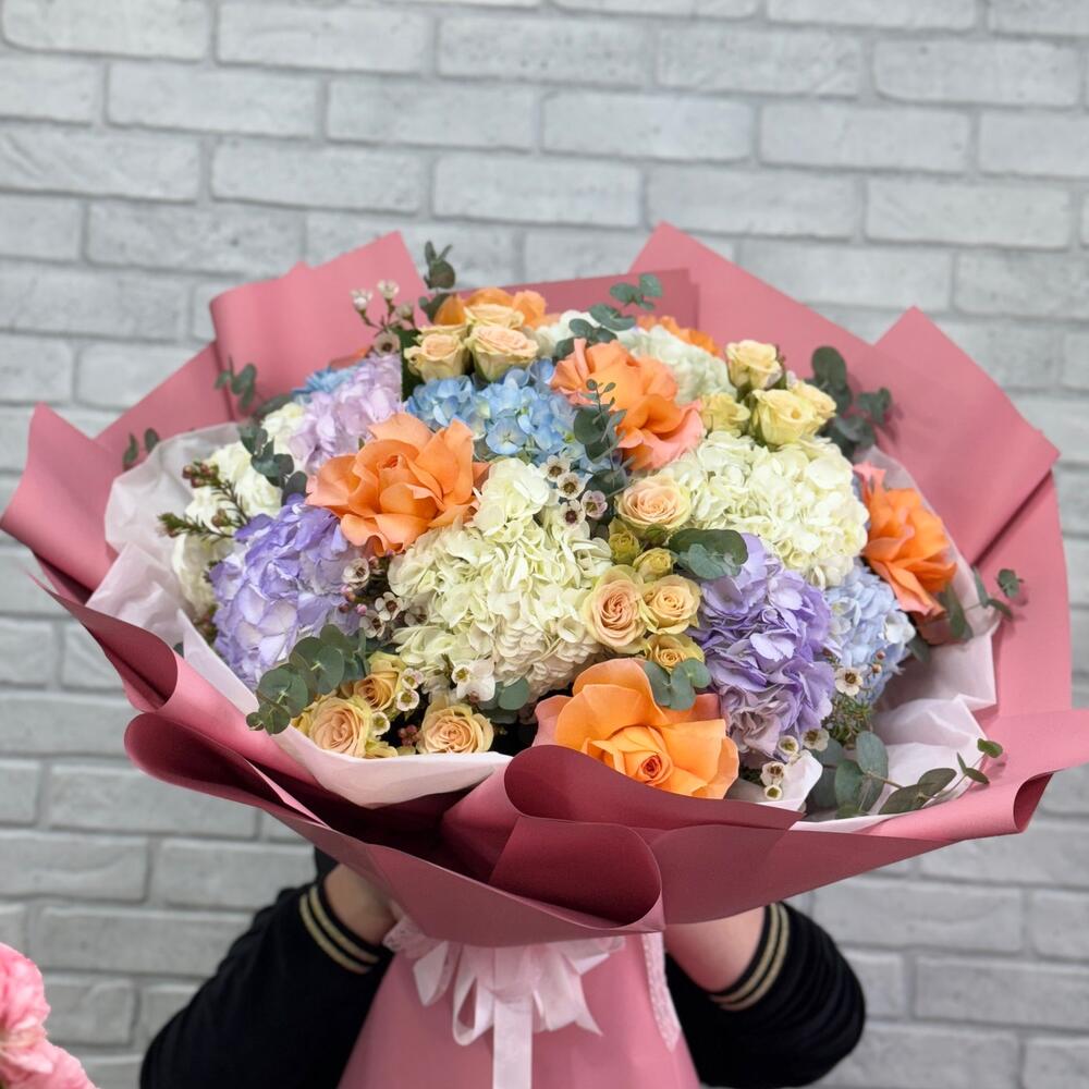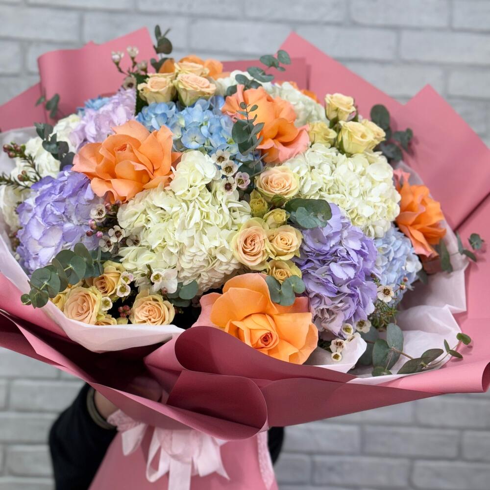 Ваксфлауэр - 3 шт. Гортензия - 15 шт. Лента - 2 шт. Эвкалипт - 3 шт. Роза - 7 шт. Упаковка - 8 шт. Спрей роза - 3 шт.