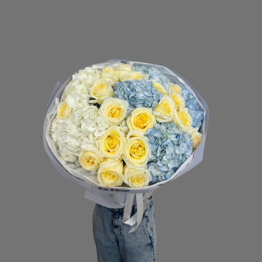 Объёмный букет из разноцветной гортензии и жёлтых пионовидных роз — яркий, солнечный и эффектный подарок. Подходит для поздравления, дня рождения, юбилея и поднятия настроения. Пионовидные розы выглядят роскошно и трендово. Если вы ищете «большой букет гортензий купить», «яркий букет с доставкой», «цветы для девушки необычные», эта композиция привлечёт внимание и вызовет восторг.